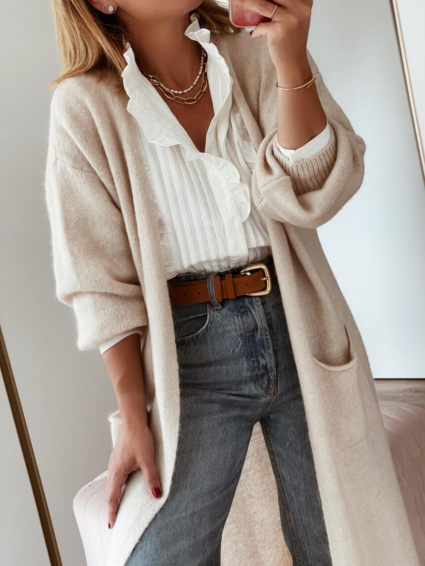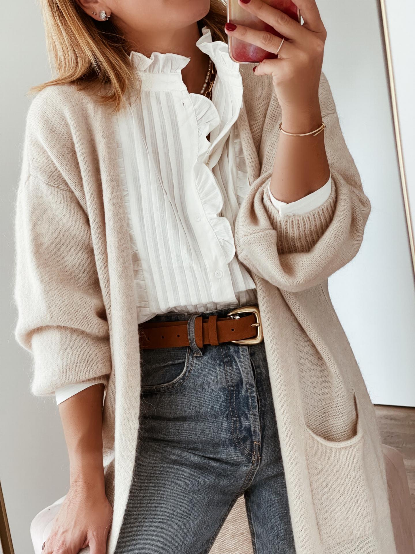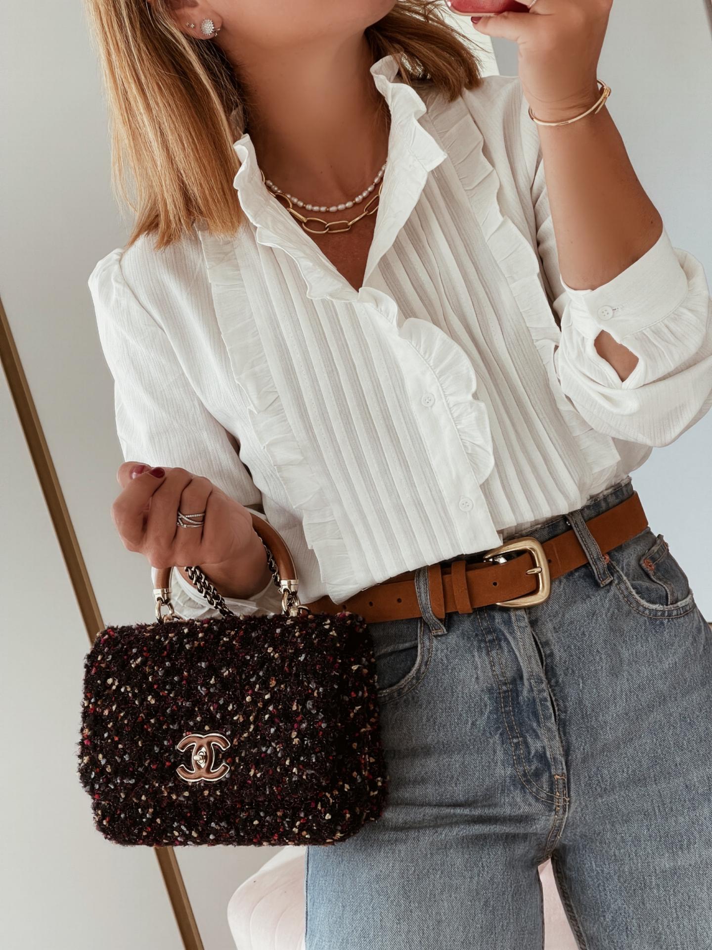 Camisa Núria de tejido de algodón grabado , cuello caja con volante alrededor del cuello, delantero abotonado con pechera de tablillas y volante de arriba a abajo , puño de la manga con botón.