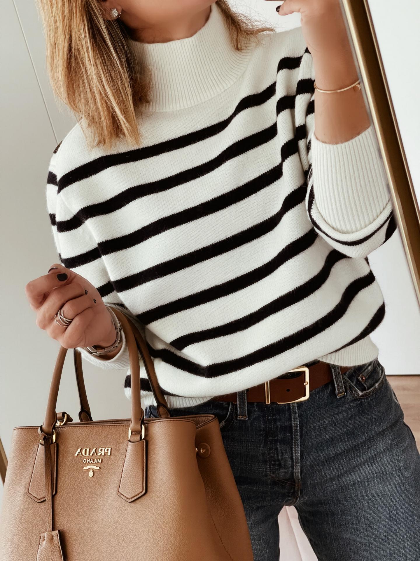 Nuevo Jerseh con botones en los hombros, corte recto y rayas en azul marino.
