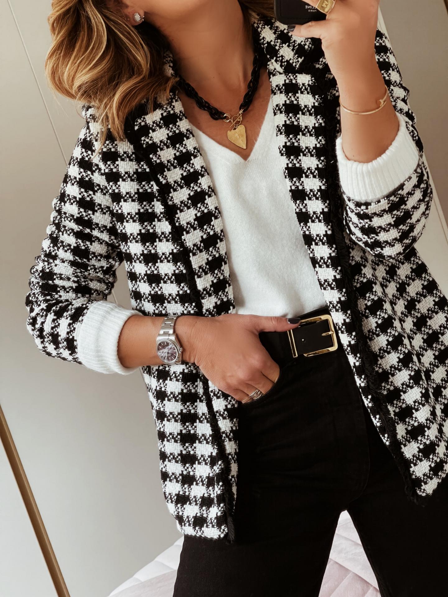 Chaqueta Tweed en cuadros pata de gallo en blanco y negro..