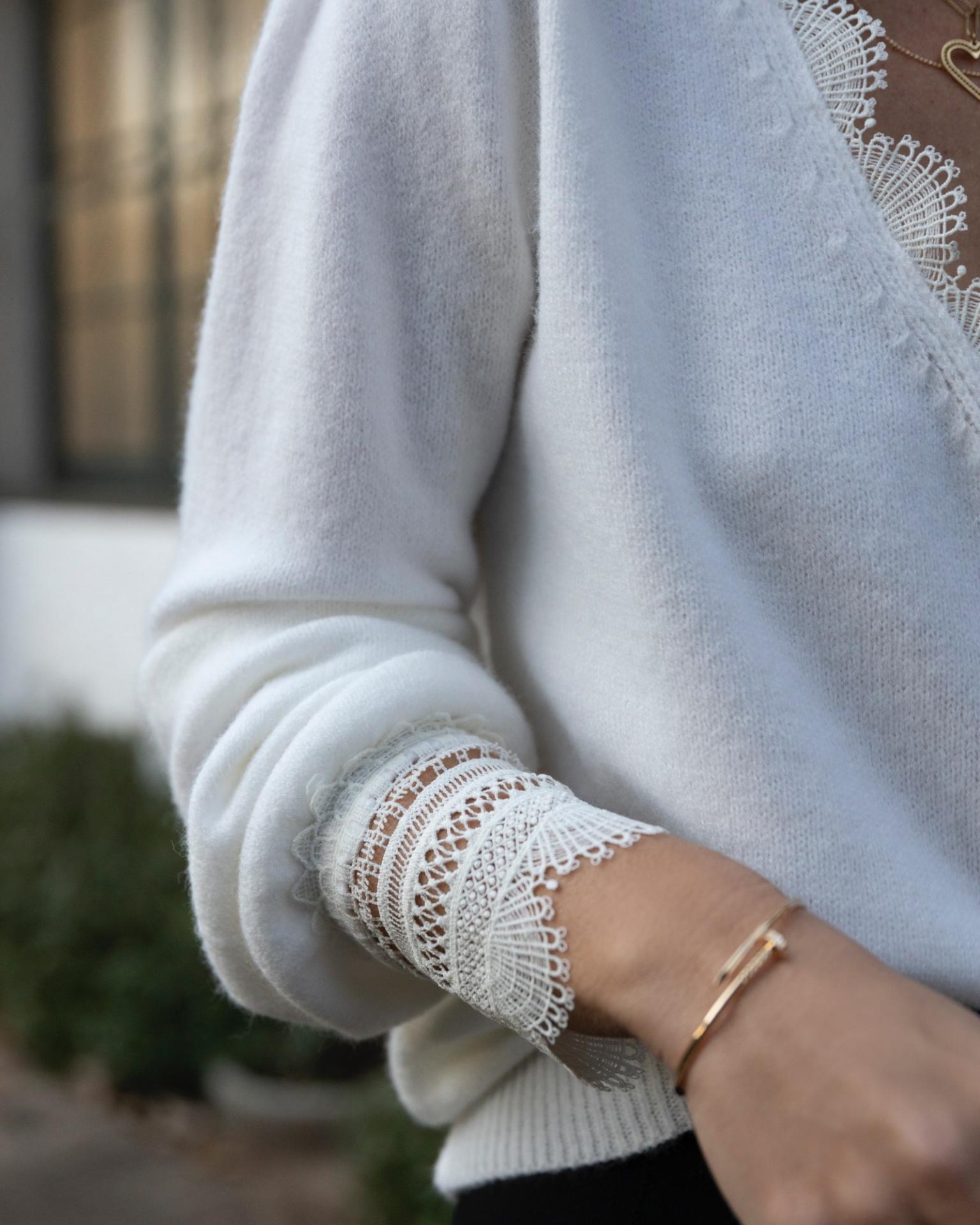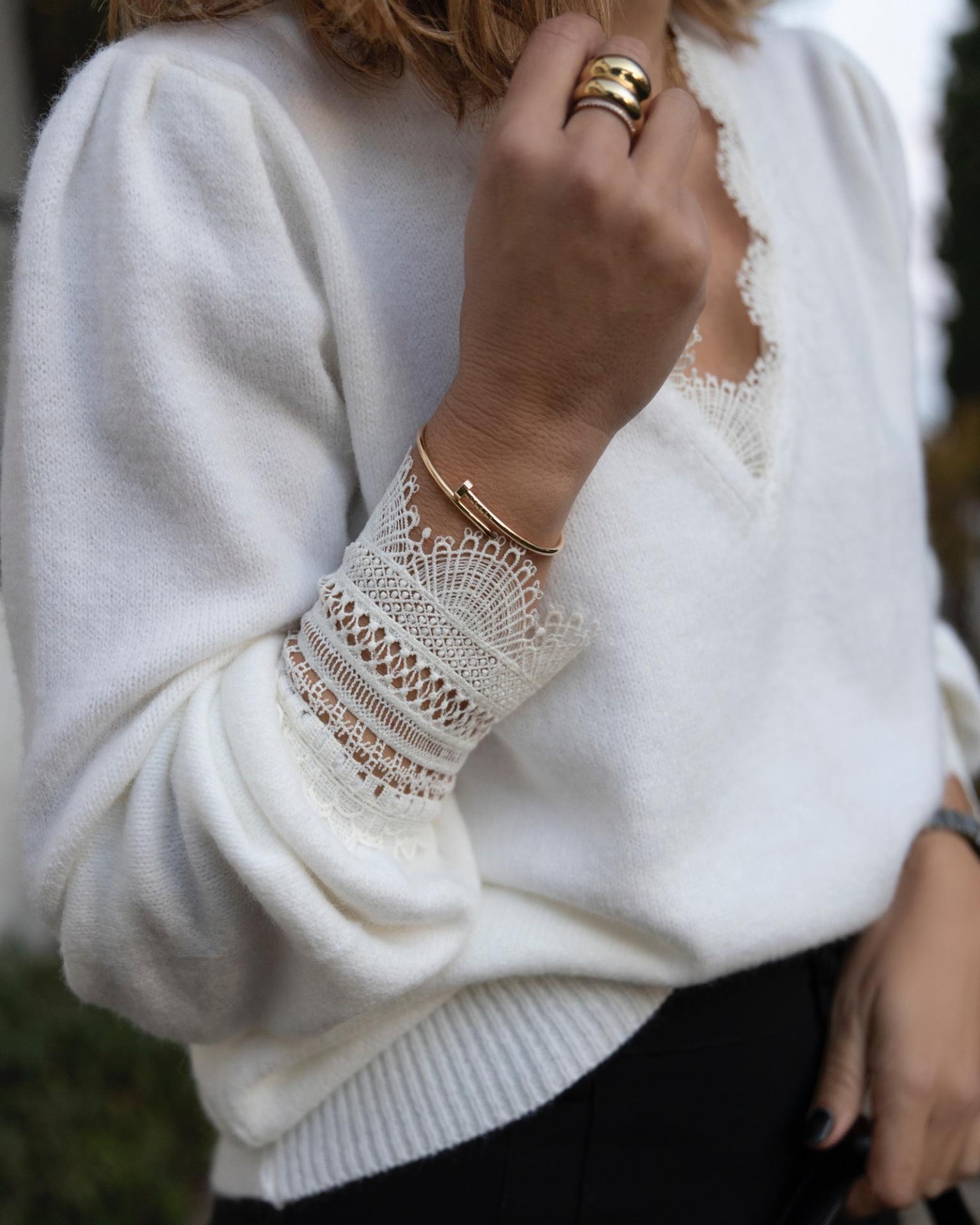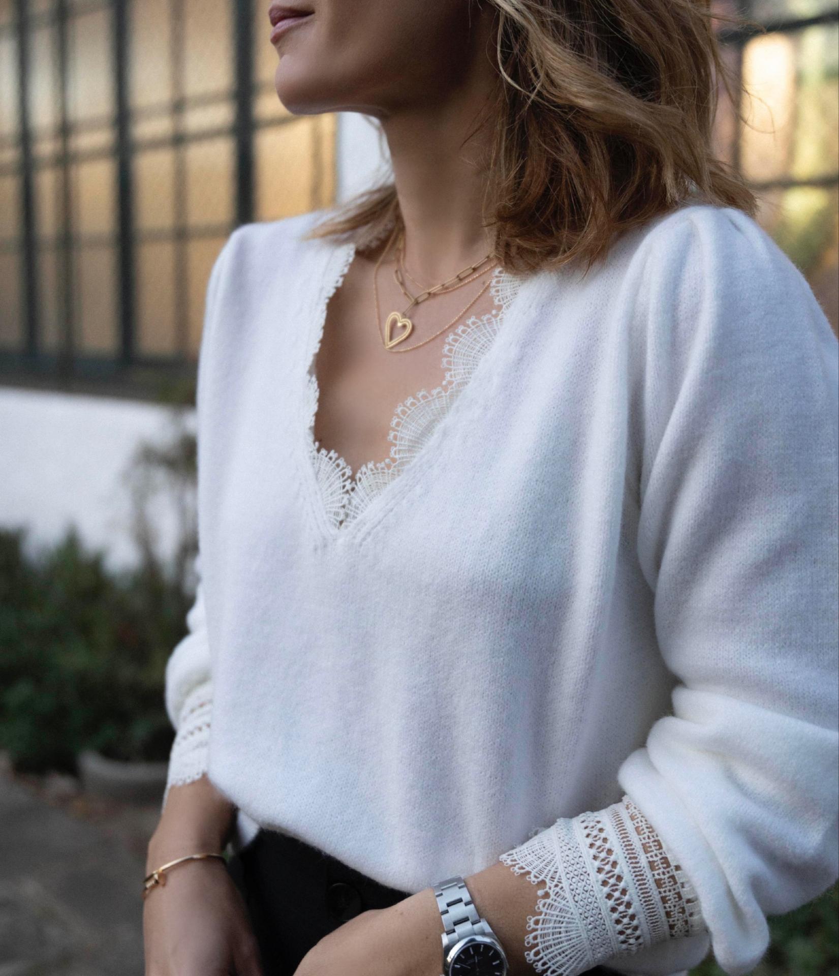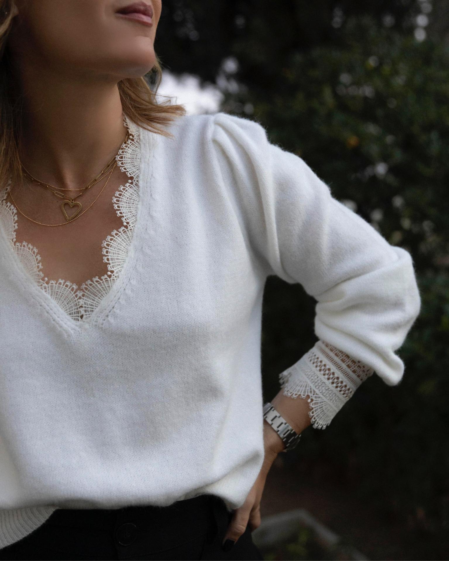Jersey cuello pico con puntilla de encaje alrededor del cuello en el delantero y puño de encaje. La manga ligeramente abullonada con pinzas en el hombro.