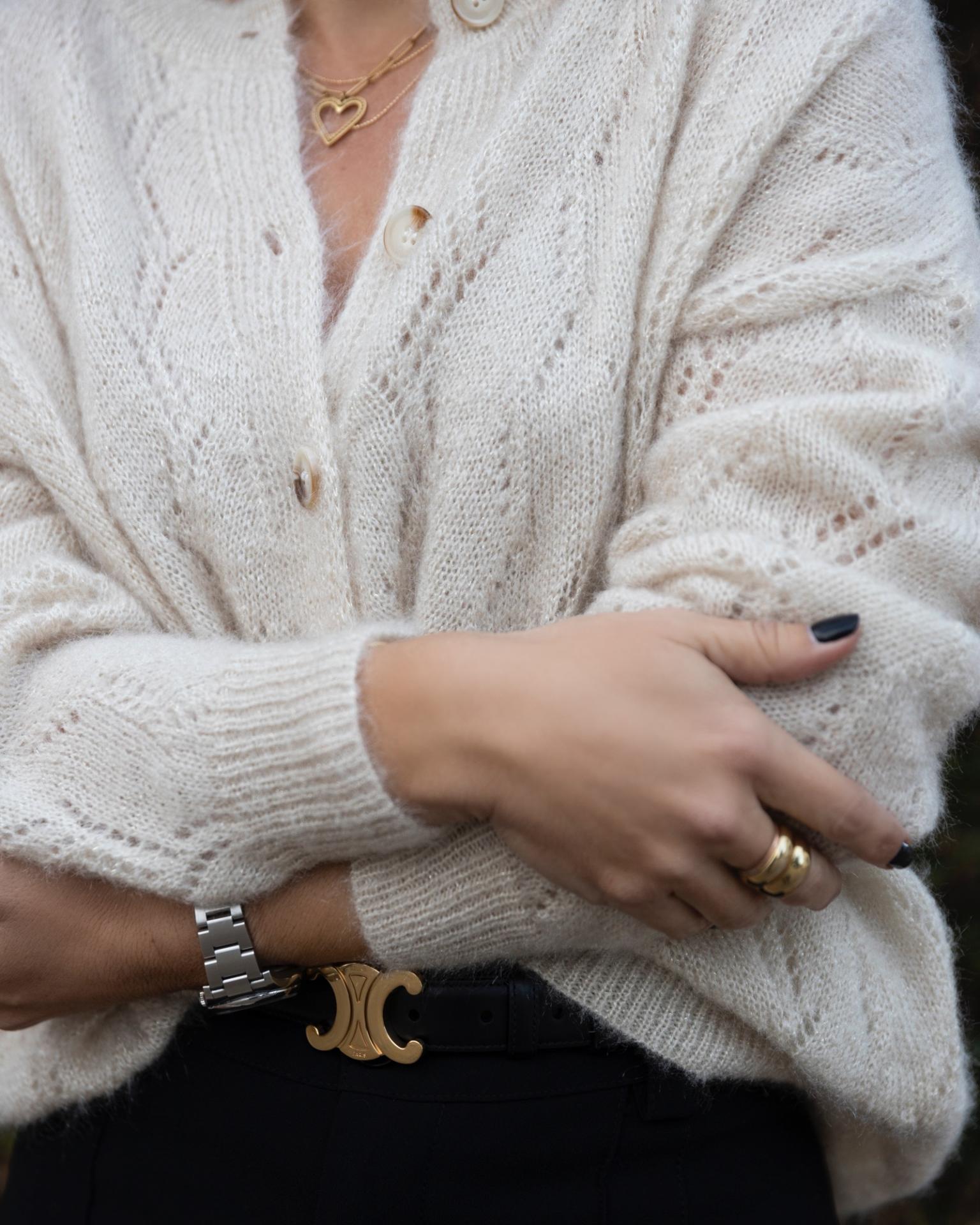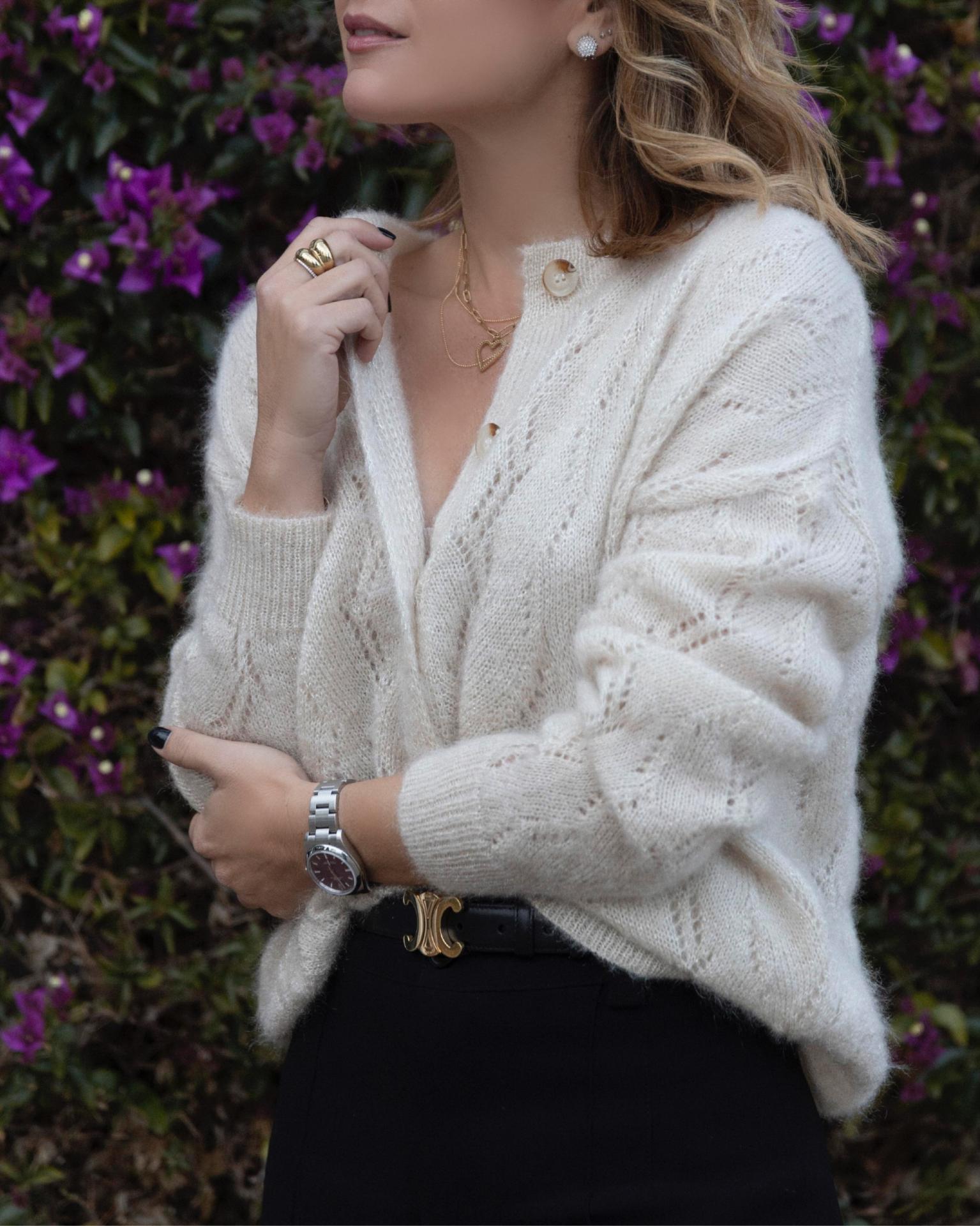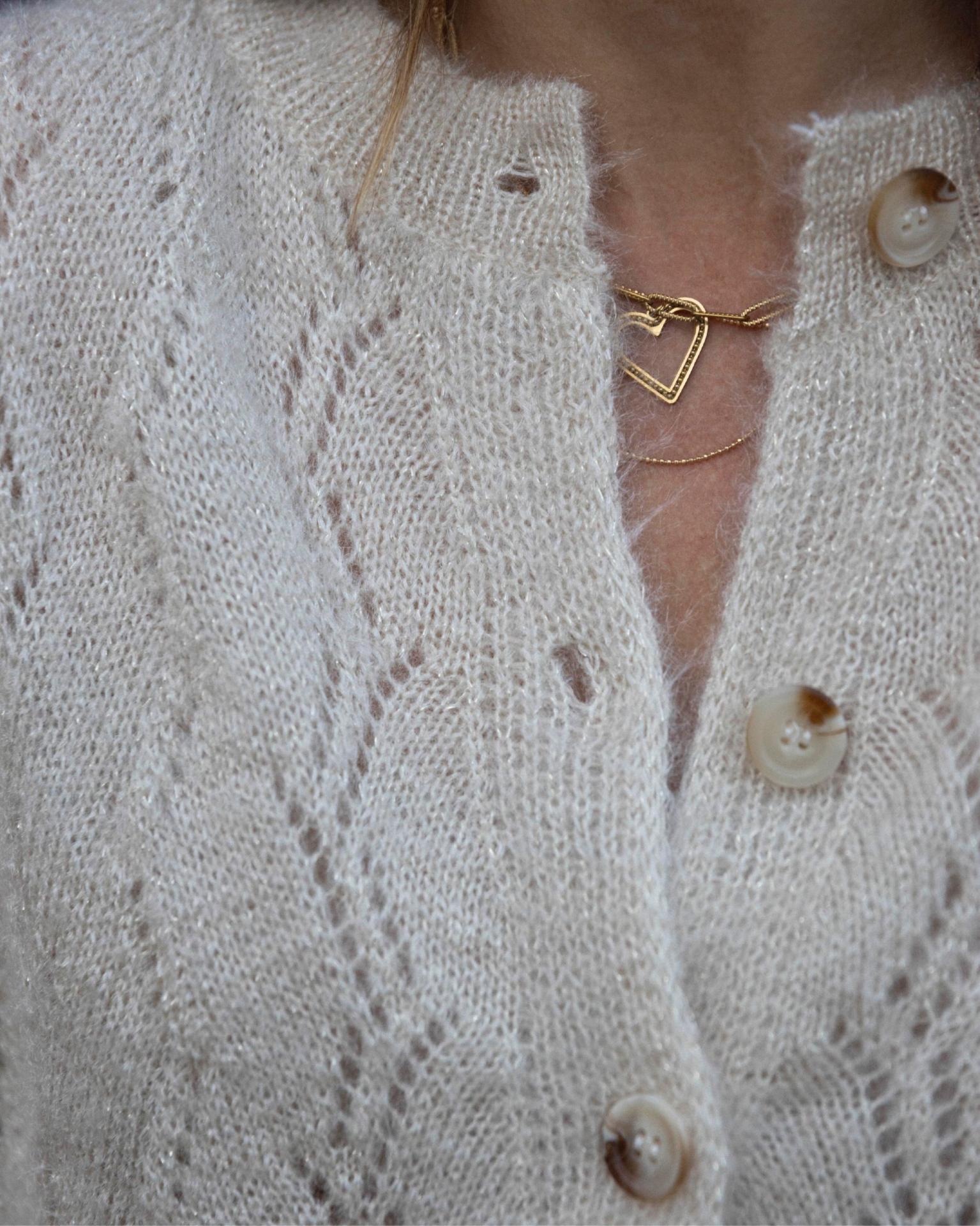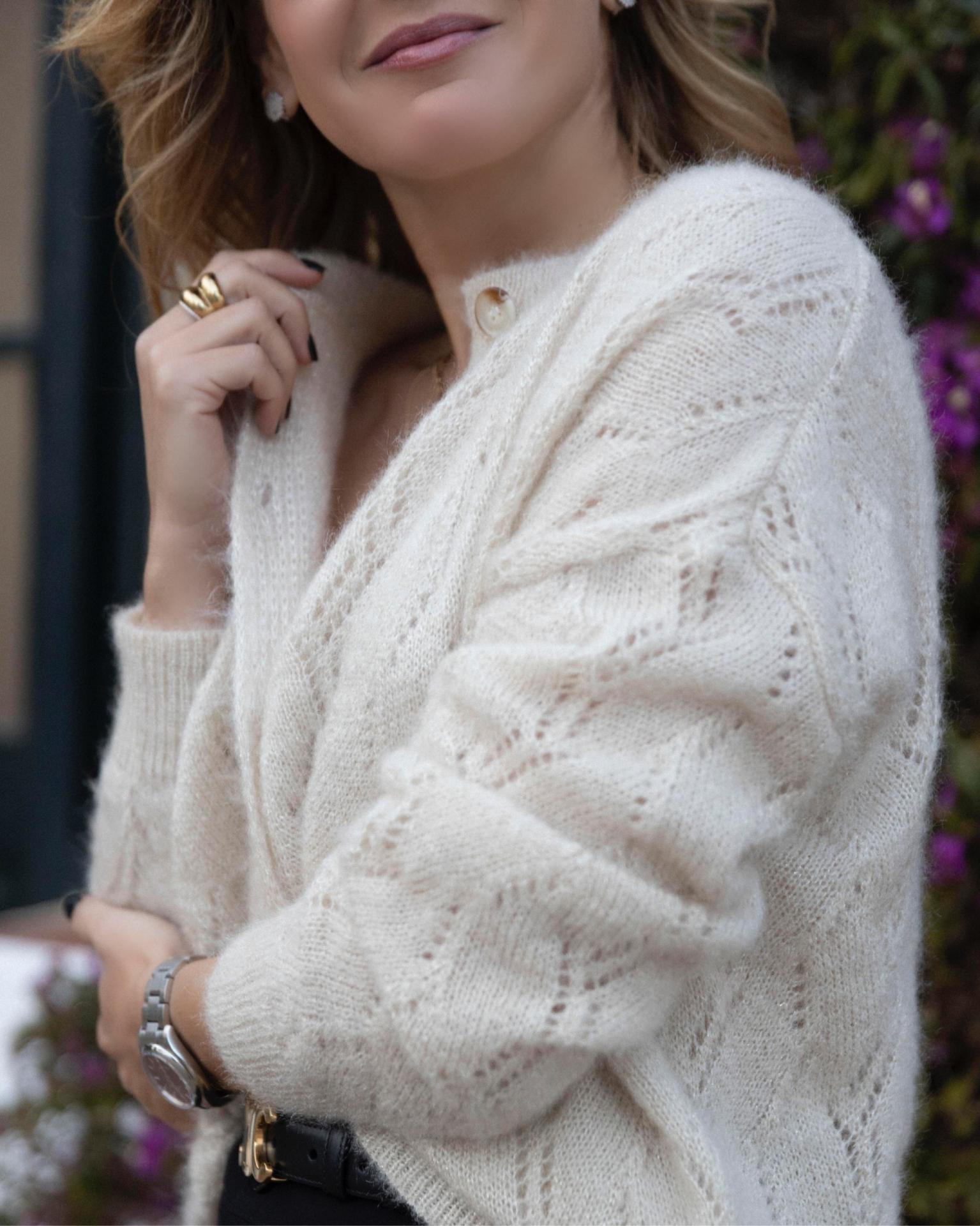 Chaqueta cuello caja calada con hilo de lurex, es muy suave , amorosa y no pica.