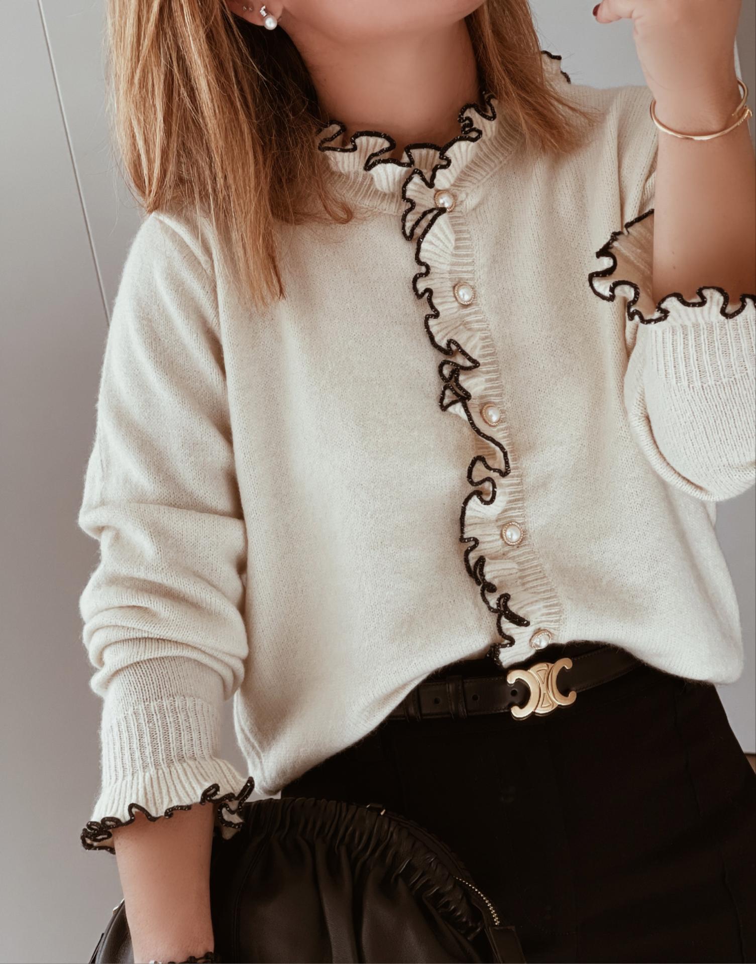 Nueva Chaqueta en tonos crudo y negro con detalle de volantes en escote y puños. Botones perla de fantasía,