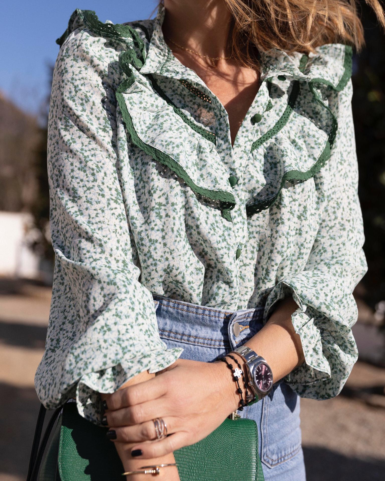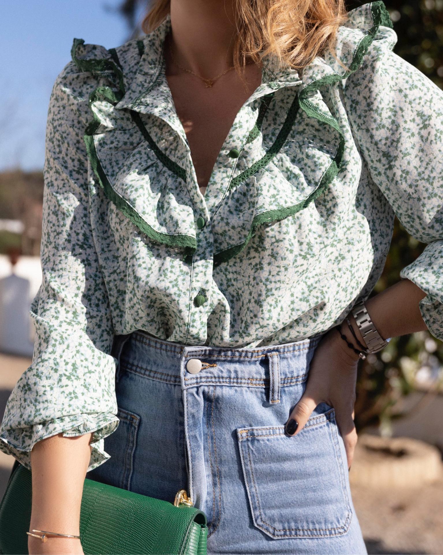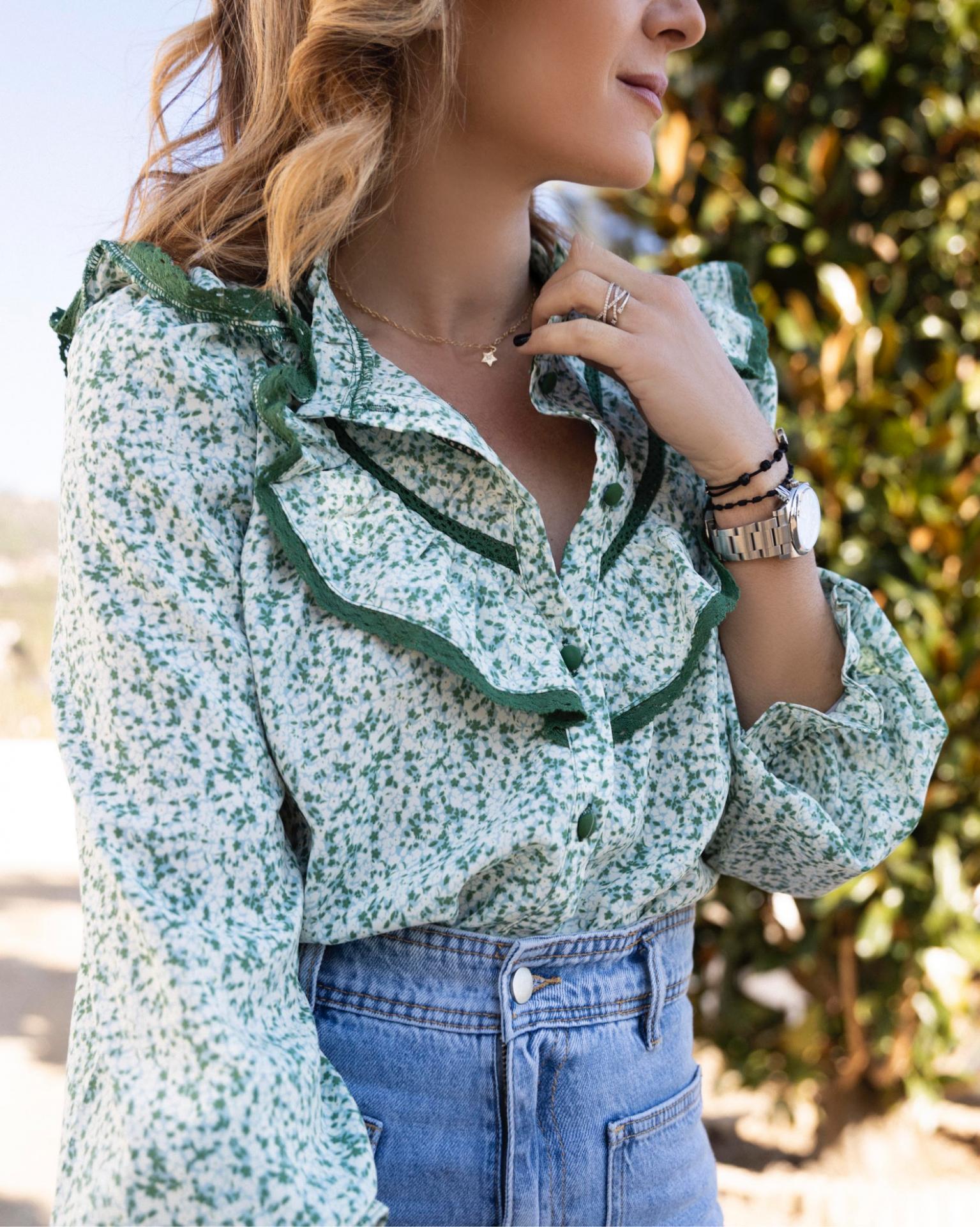 Blusa cuello caja con detalle de volantito. Viene con un volante en hombro que baja por el delantero en forma de pico y detalle de puntilla en el extremo y en delantero . Mangas con fruncido en el puño con goma y canesú en la espalda un poco fruncido en el centro. Botones forrados. Es ideal para combinar con cualquiera de nuestros chaquetas de punto o cárdigan lisos.