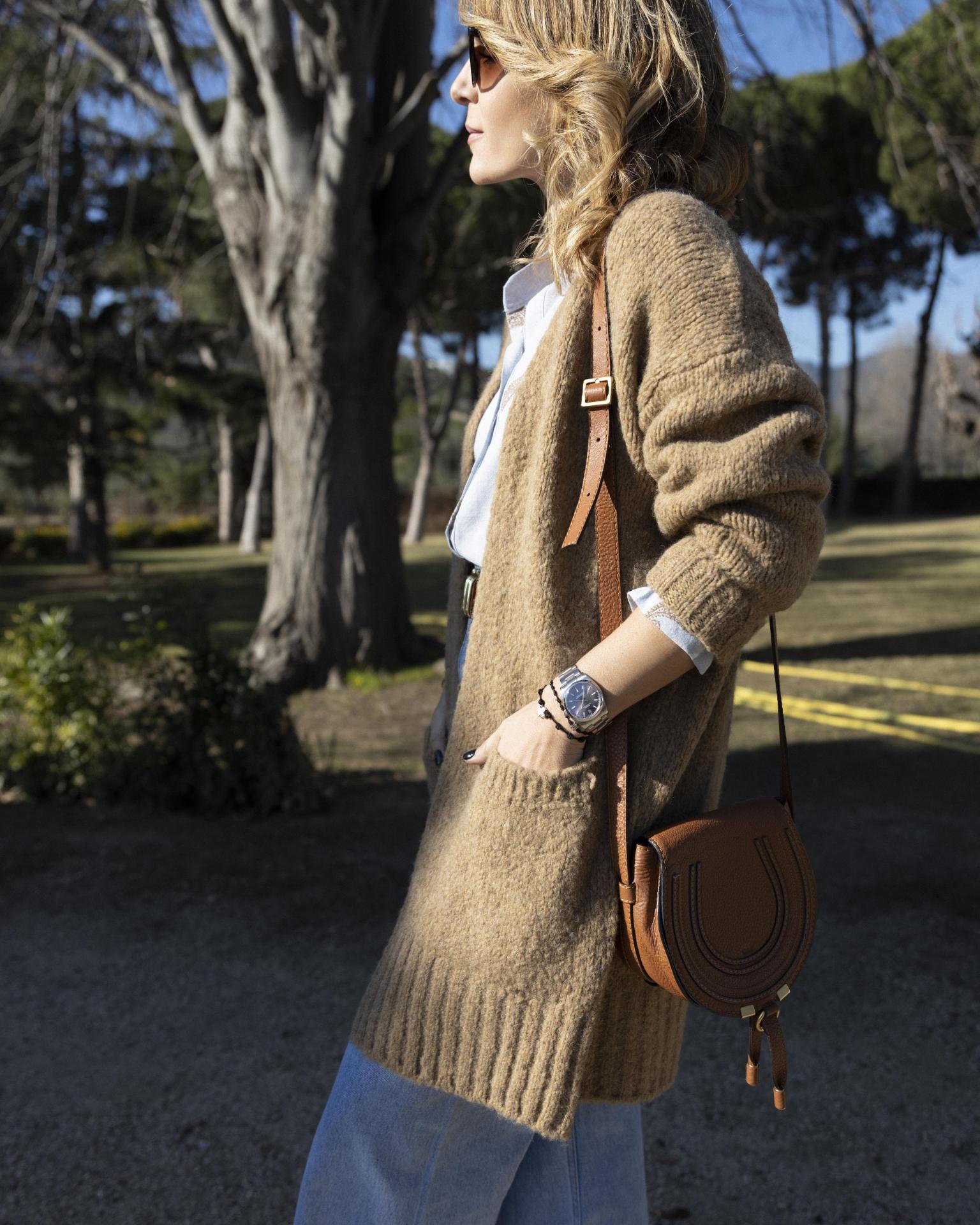 Cárdigan 3/4 de lana, abierto y con bolsillos en el delantero.
