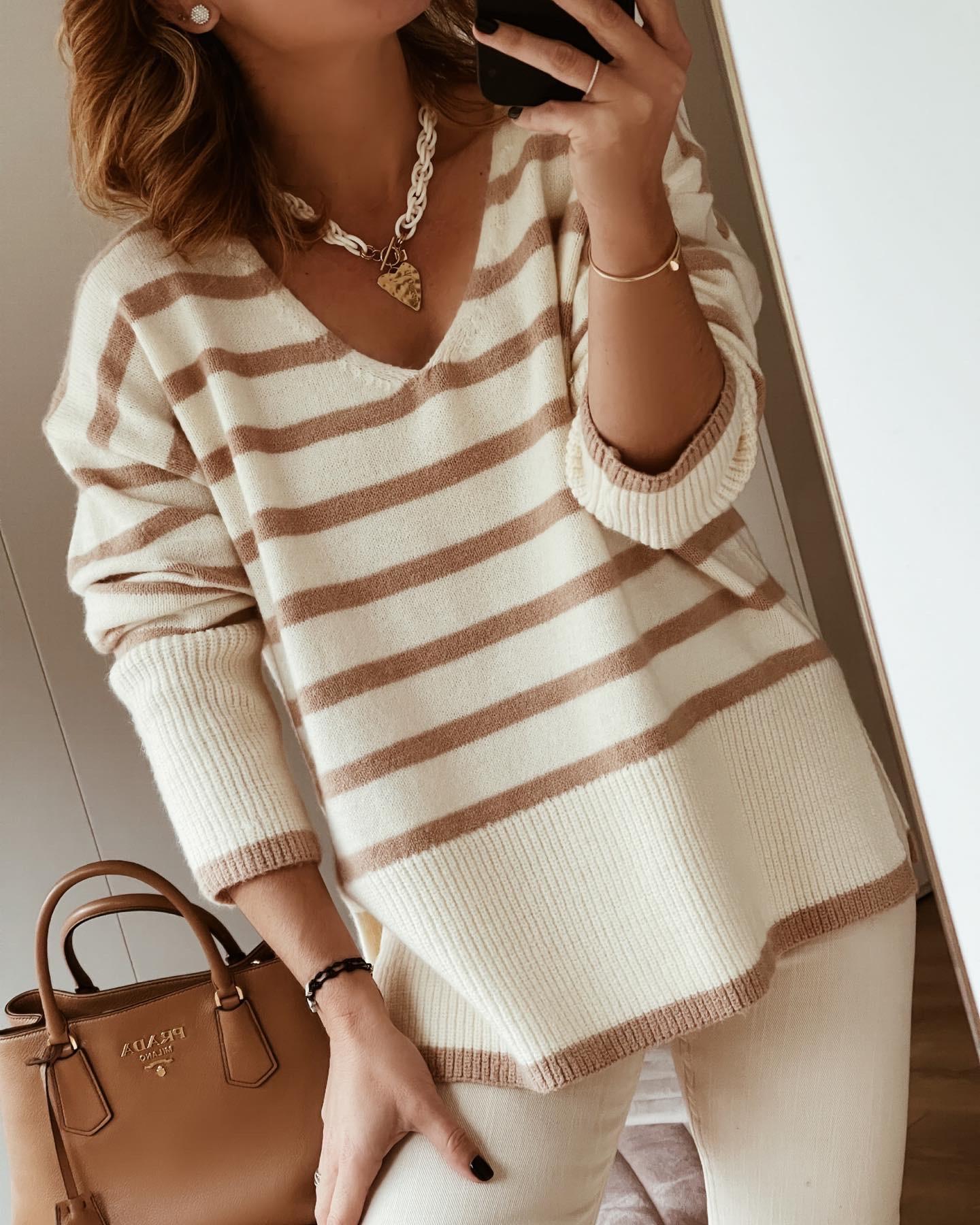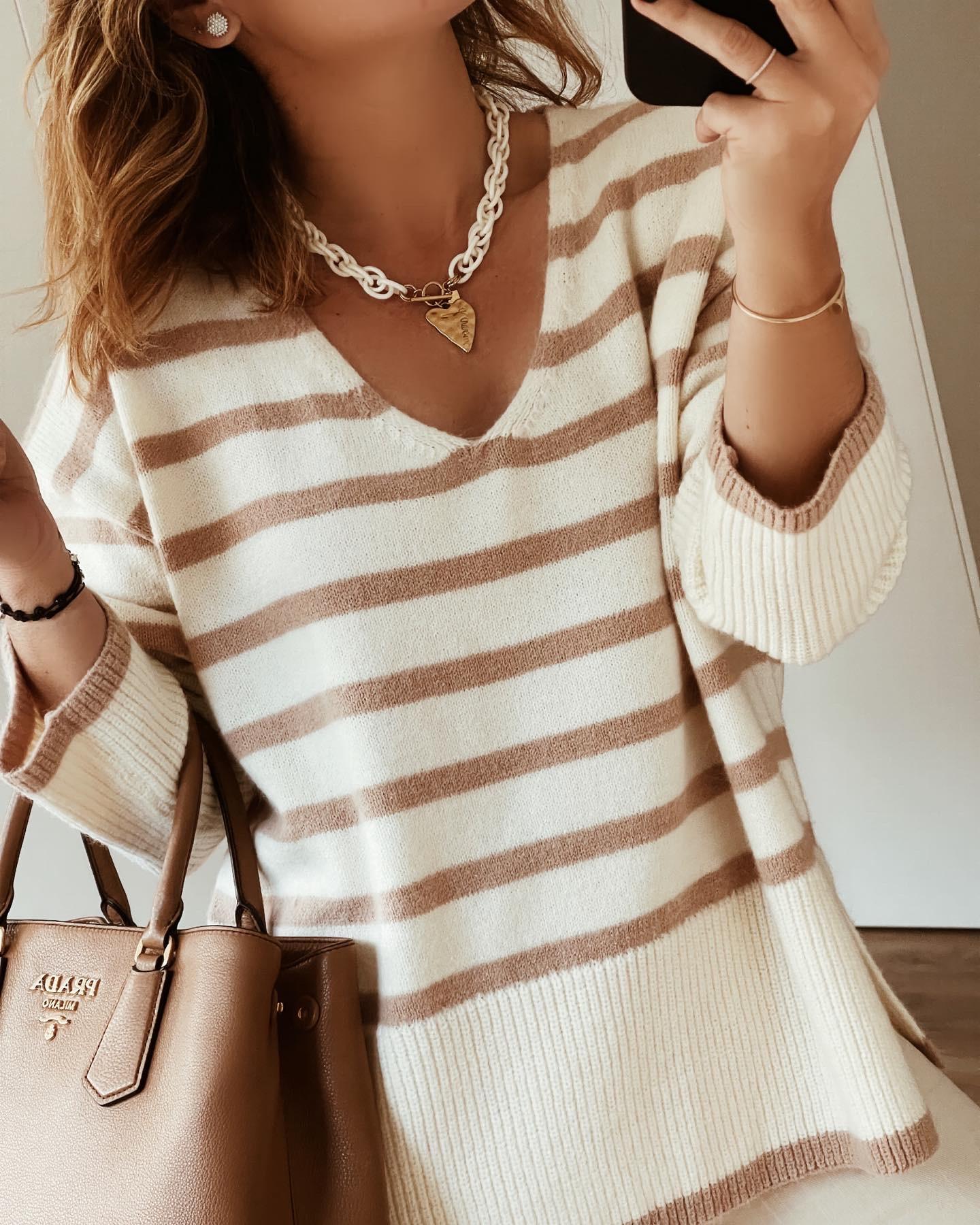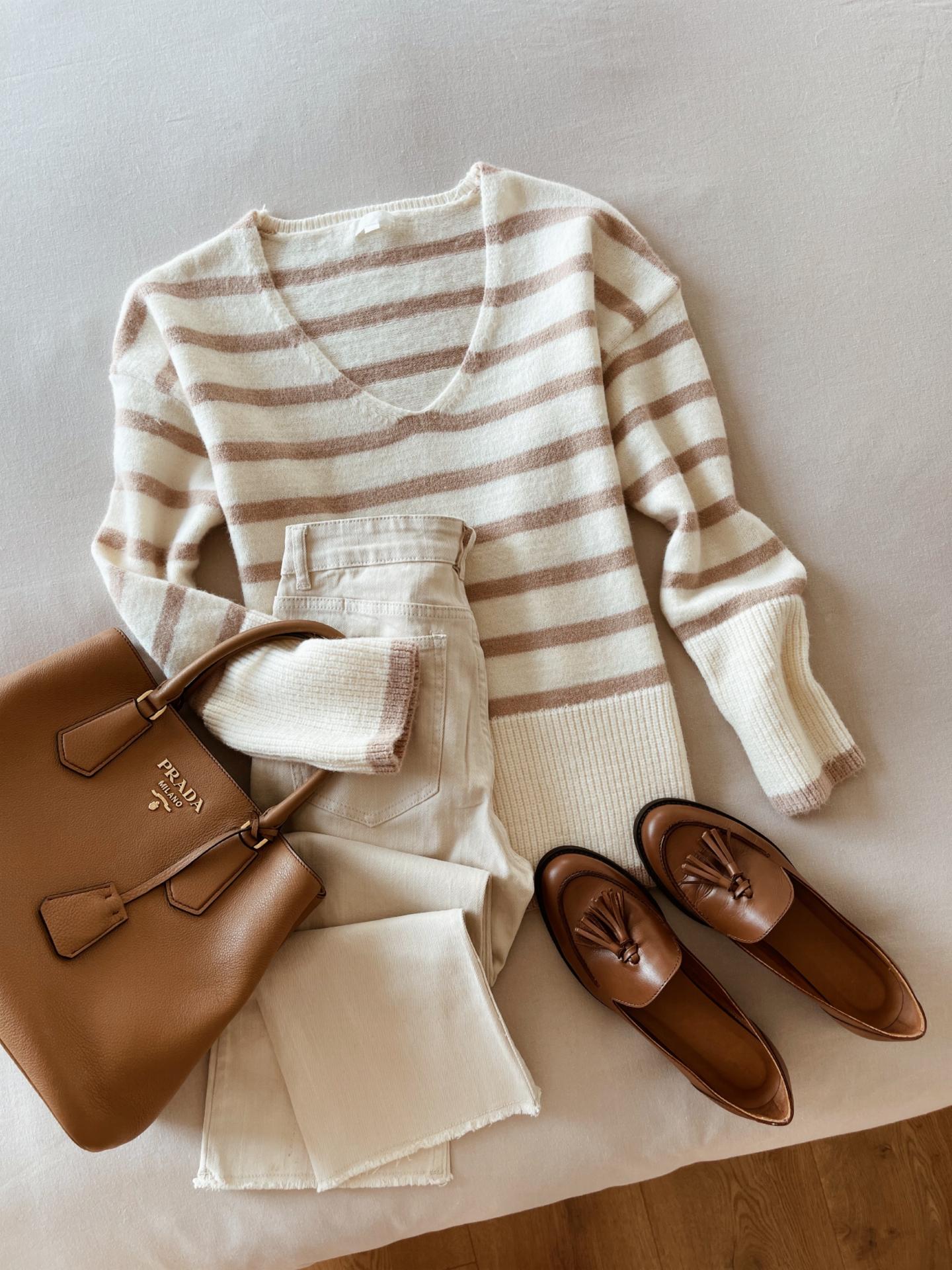 Nuevo jersey de corte recto y amplio en rayas beige y taupe , escote pico y con pequeña abertura en los laterales