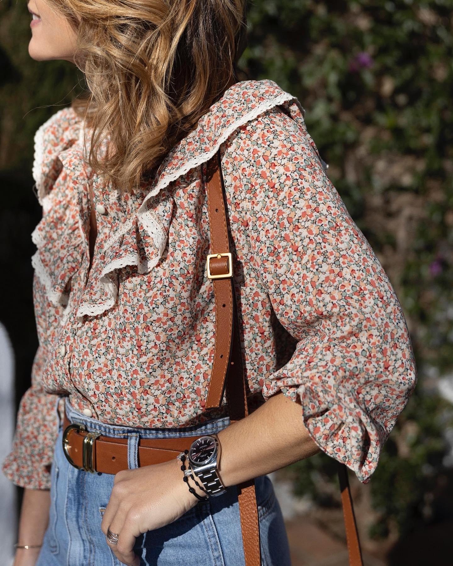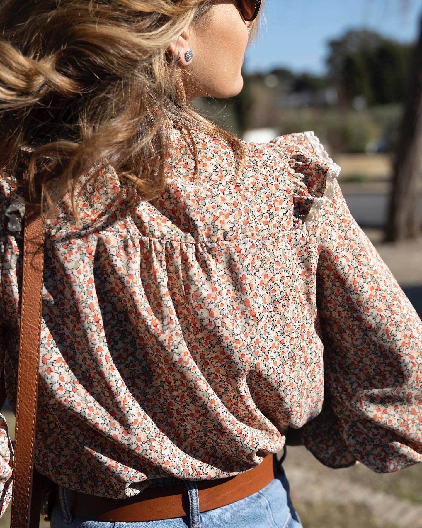 Blusa cuello caja con detalle de volantito. Viene con un volante en hombro que baja por el delantero en forma de pico y detalle de puntilla en el extremo y en delantero . Mangas con fruncido en el puño con goma y canesú en la espalda un poco fruncido en el centro. Botones forrados. Es ideal para combinar con cualquiera de nuestros chaquetas de punto o cárdigan lisos.