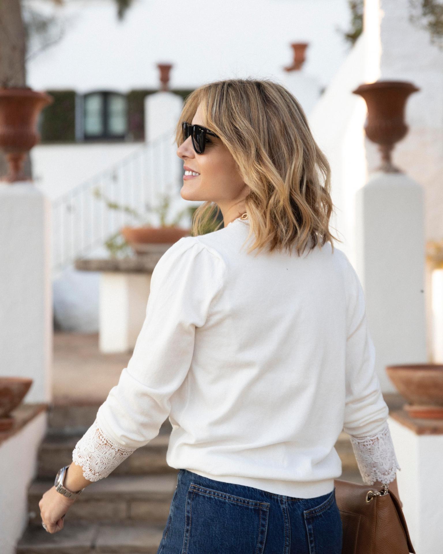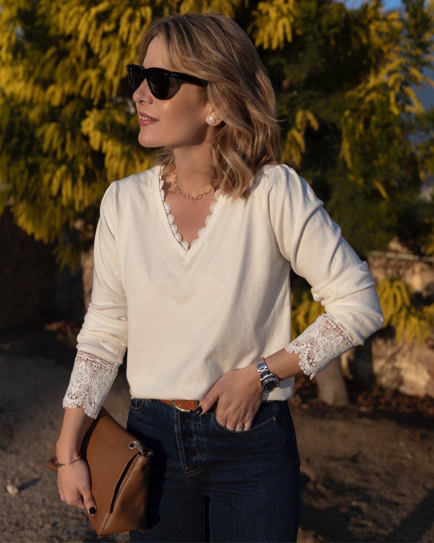 Jersey cuello pico con puntilla en escote y en puños. Detalle de pliegues en la manga.