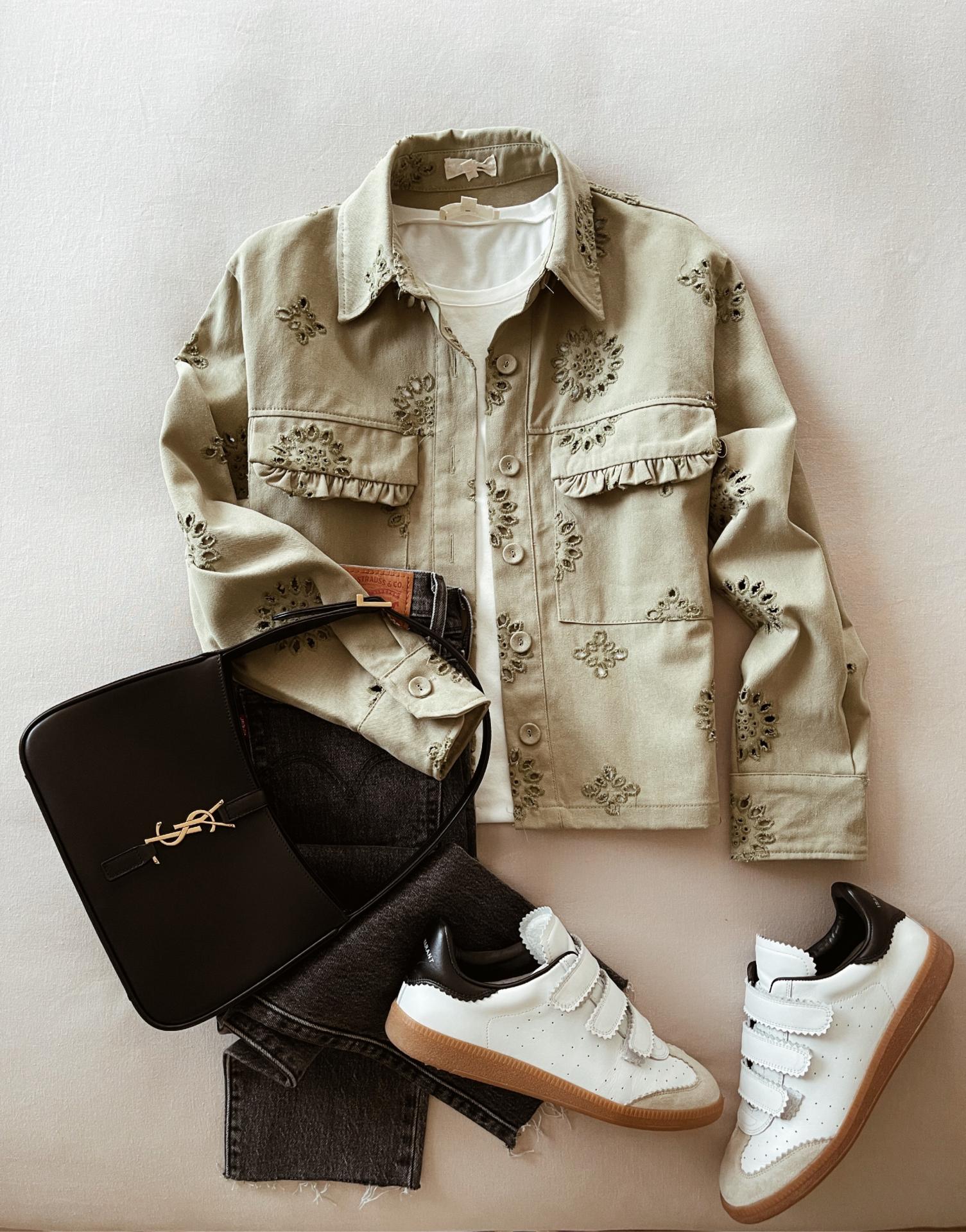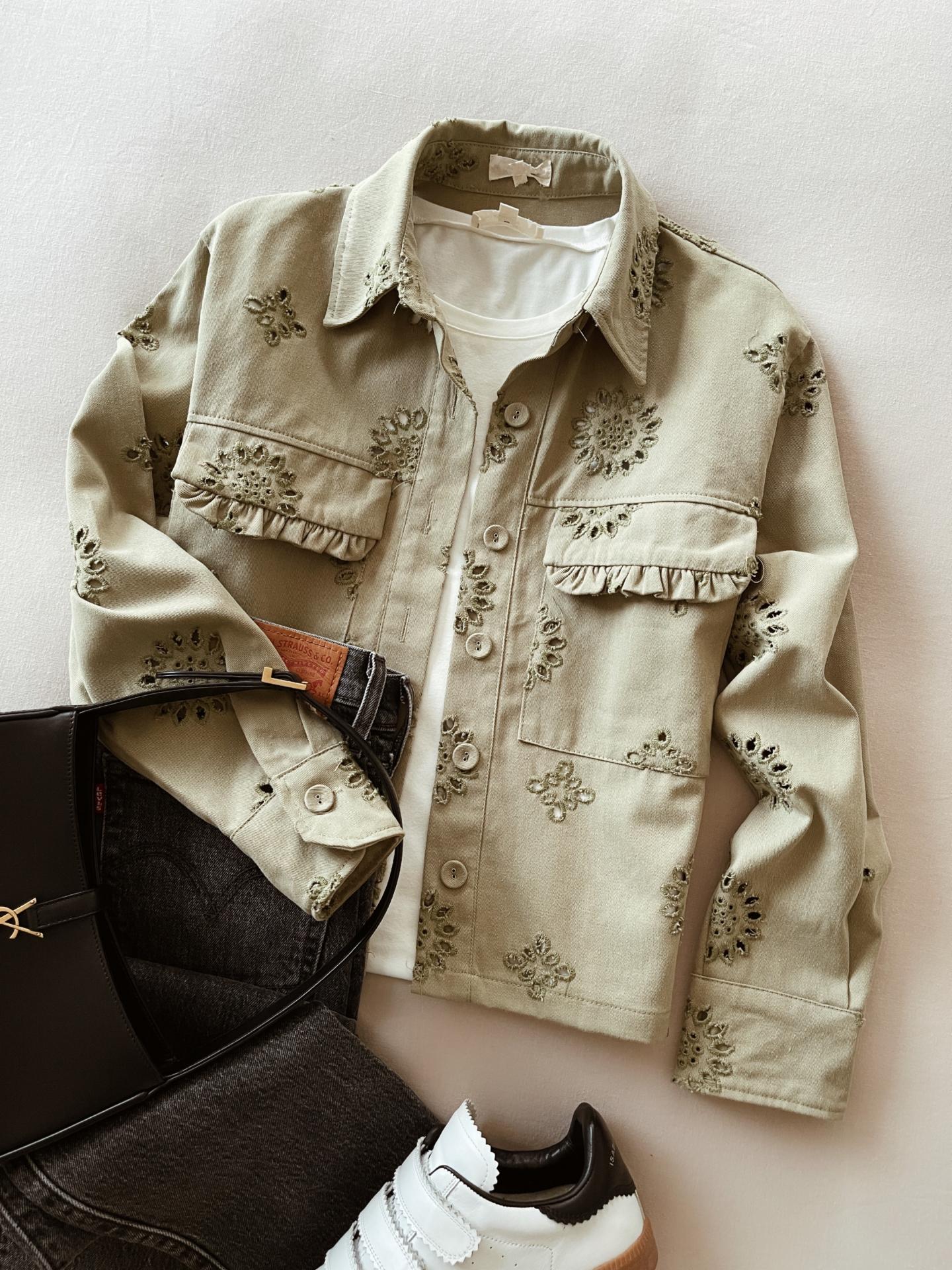 Sobrecamisa de tejido bordado, lleva bolsillos de plastrón en el delantero con solapa y detalle de volante . Botones forrados con el mismo tejido. Bajo de corte recto.