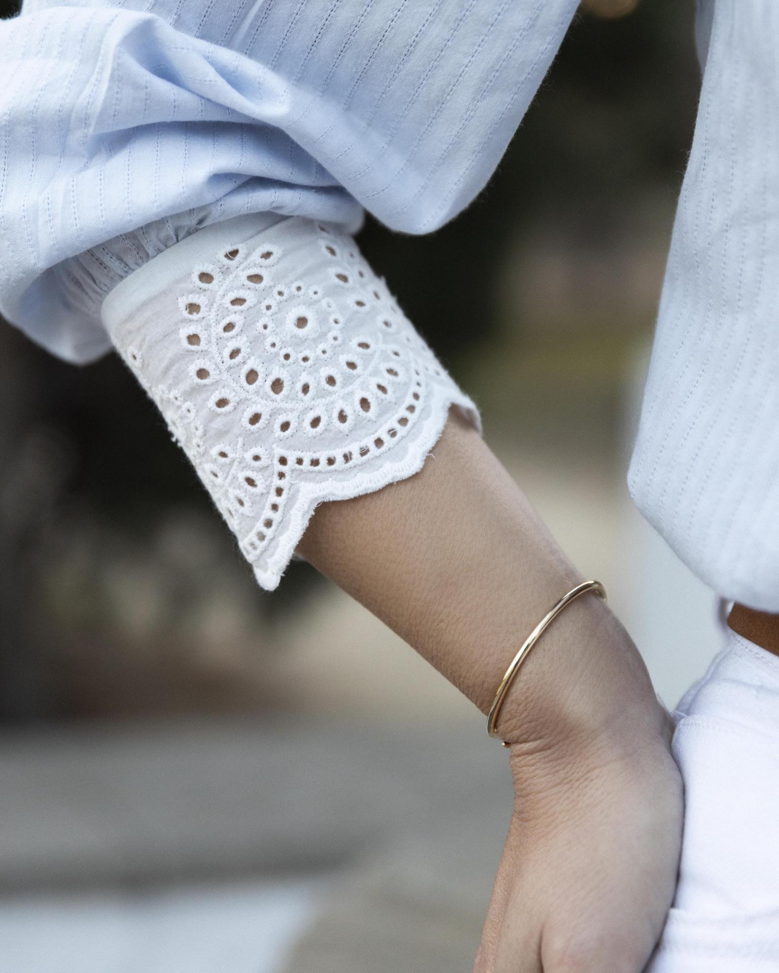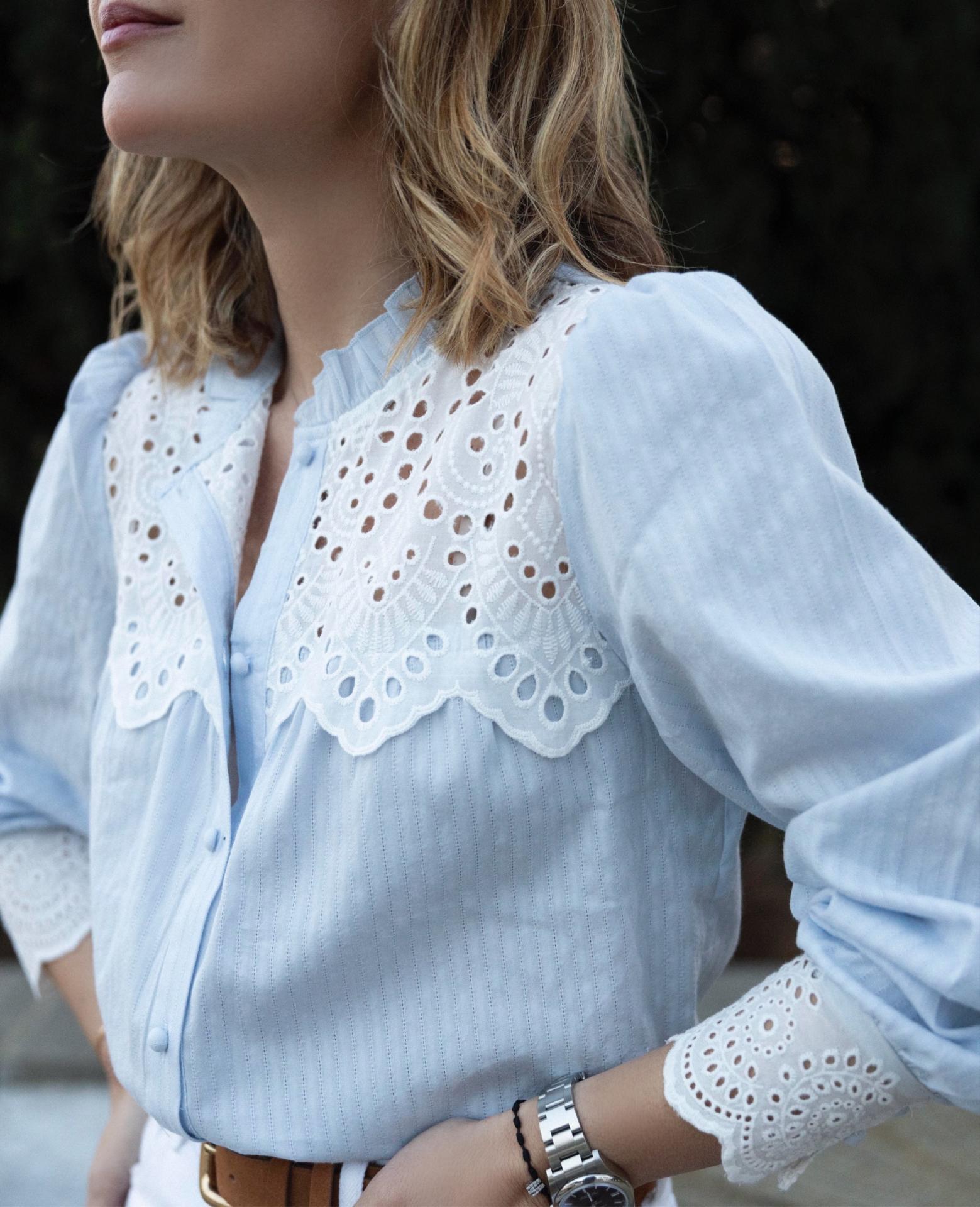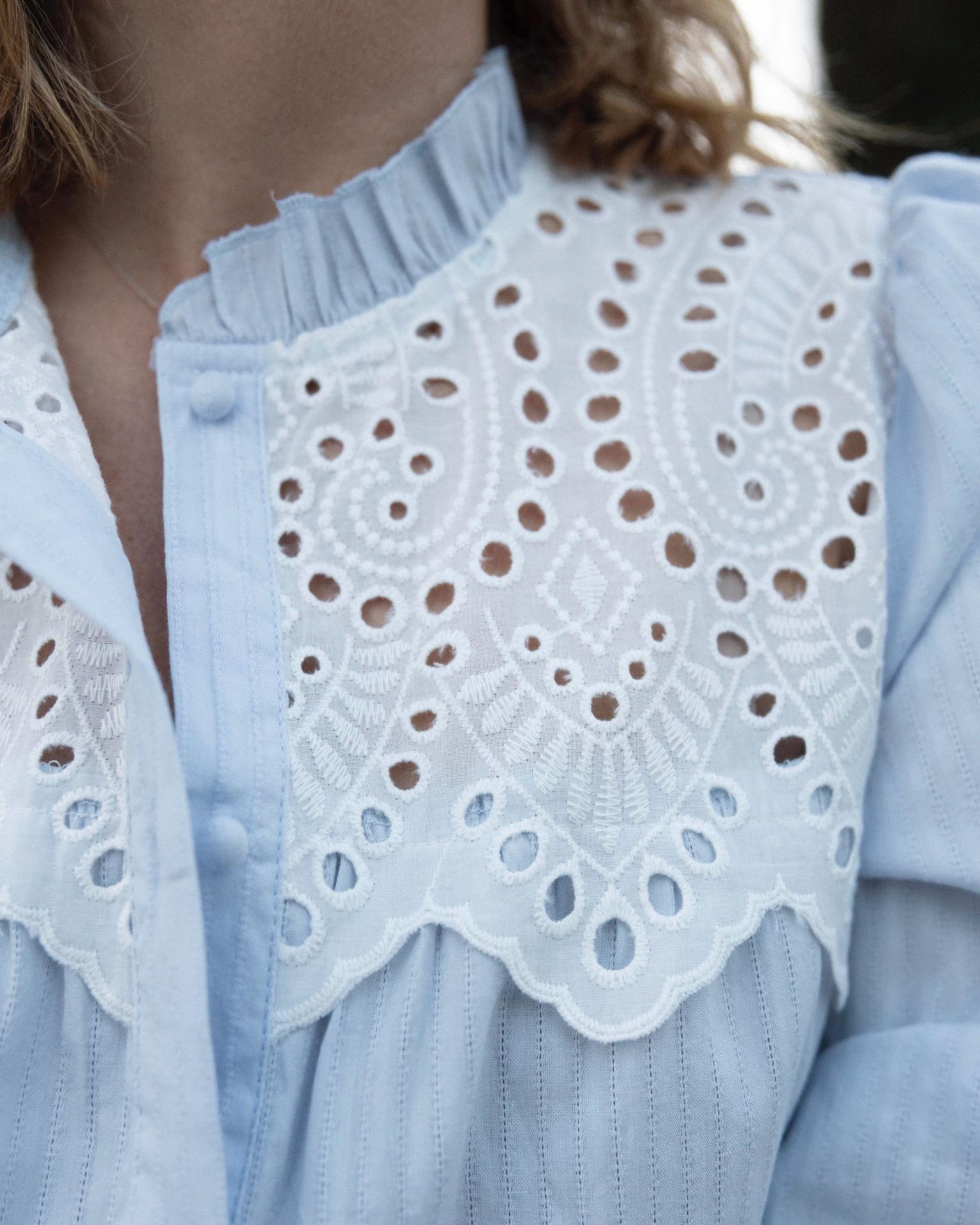 Blusa manga larga cuello caja con volante. Detalle de tejido bordado sobrepuesto en el pecho y los puños . Pecho y hombros ligeramente fruncidos. Botones forrados .Bajo recto.