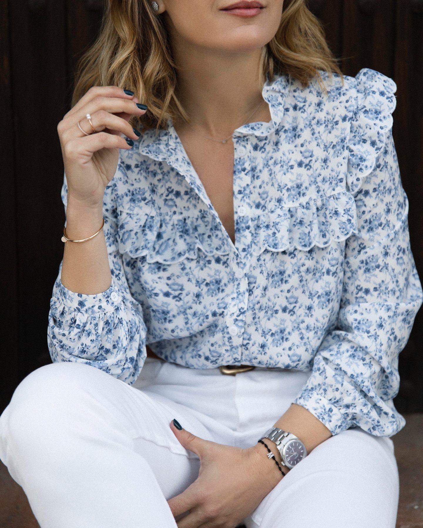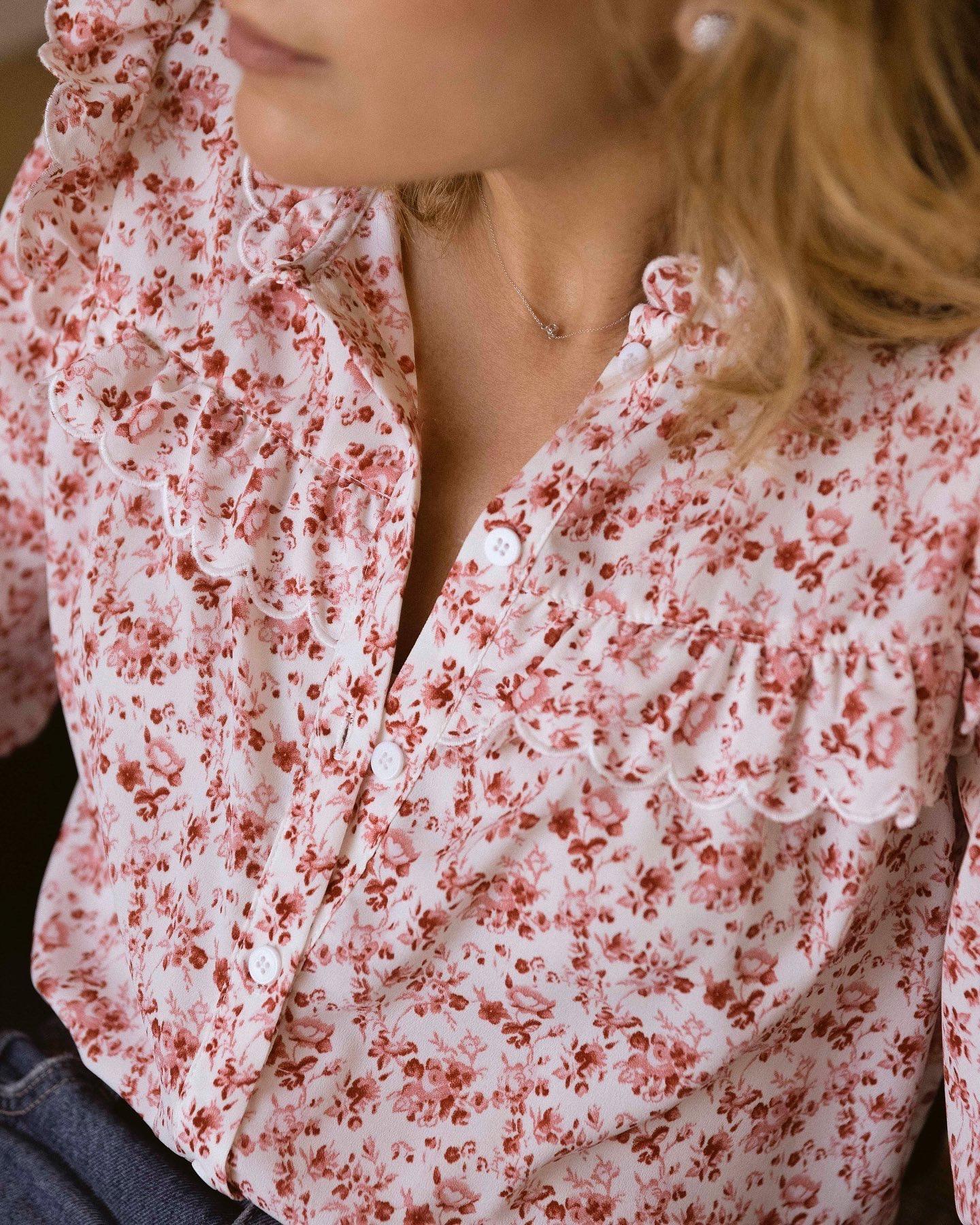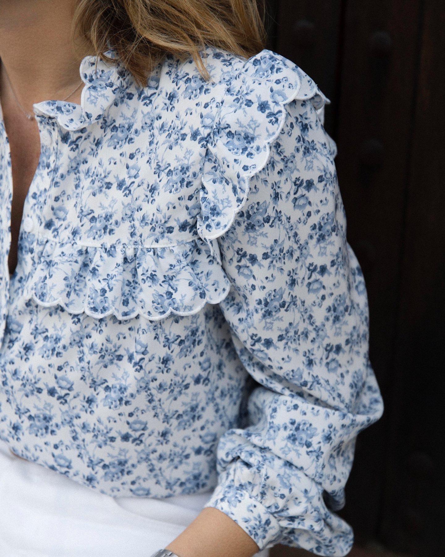 Blusa estampada con motivo Liberty, Lleva volante a la altura del pecho en el delantero, espalda y hombros. Cuello caja con volante y puños con botón.