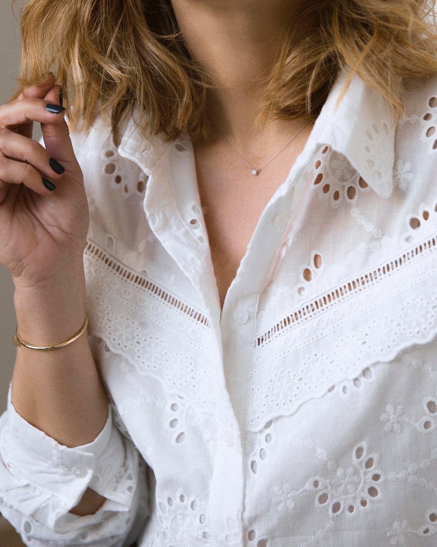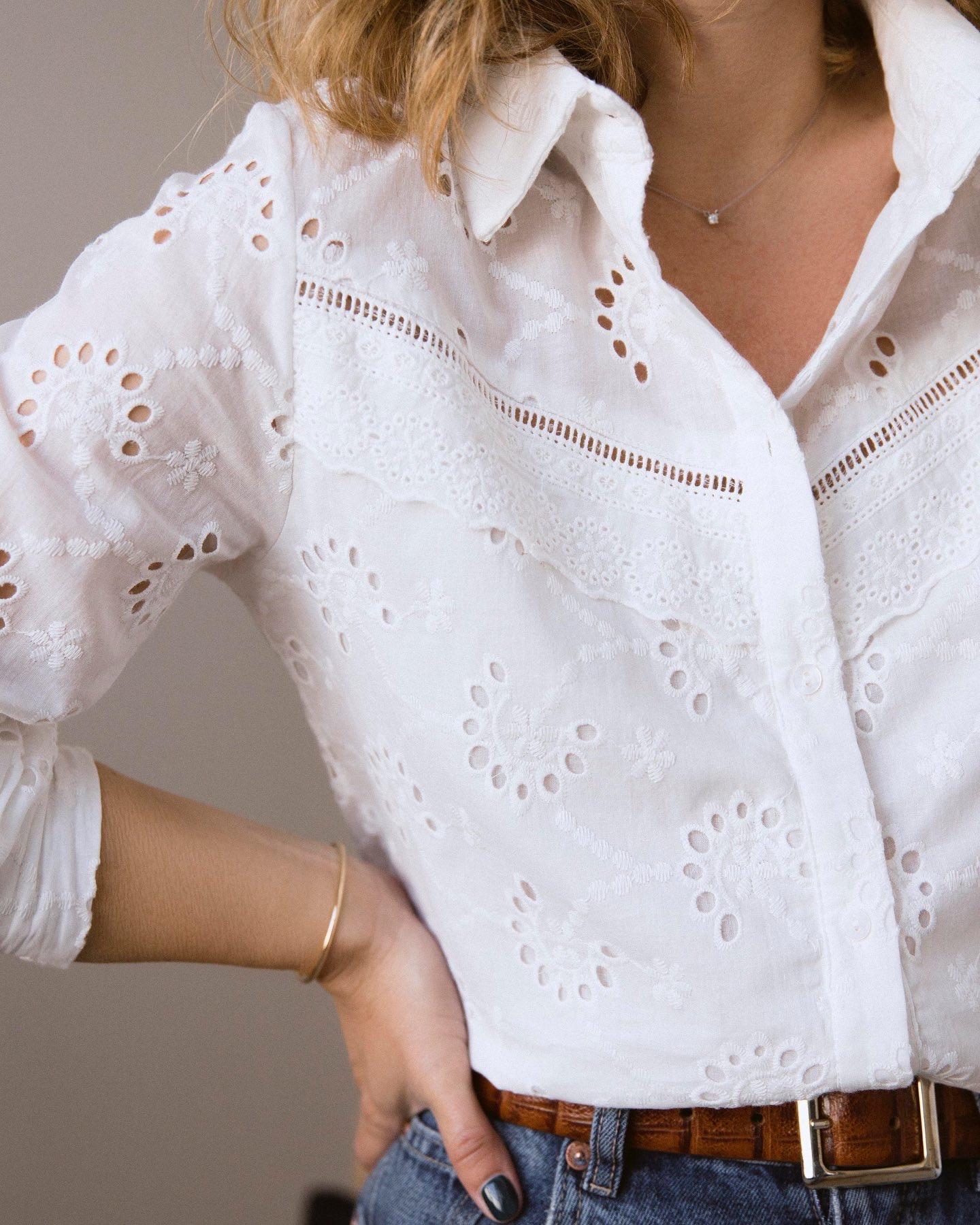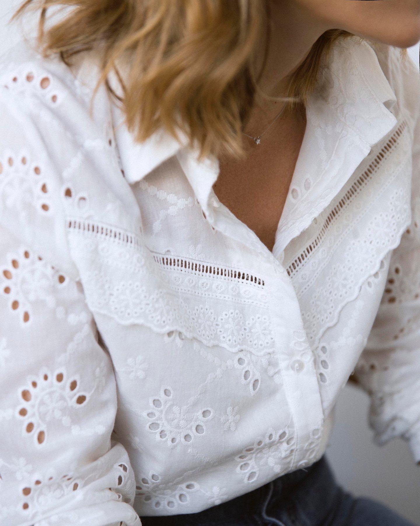 Blusa cuello camisero de tejido bordado/calado. Detalle en el delantero de puntilla. Canesú en la espalda con ligero fruncido central.