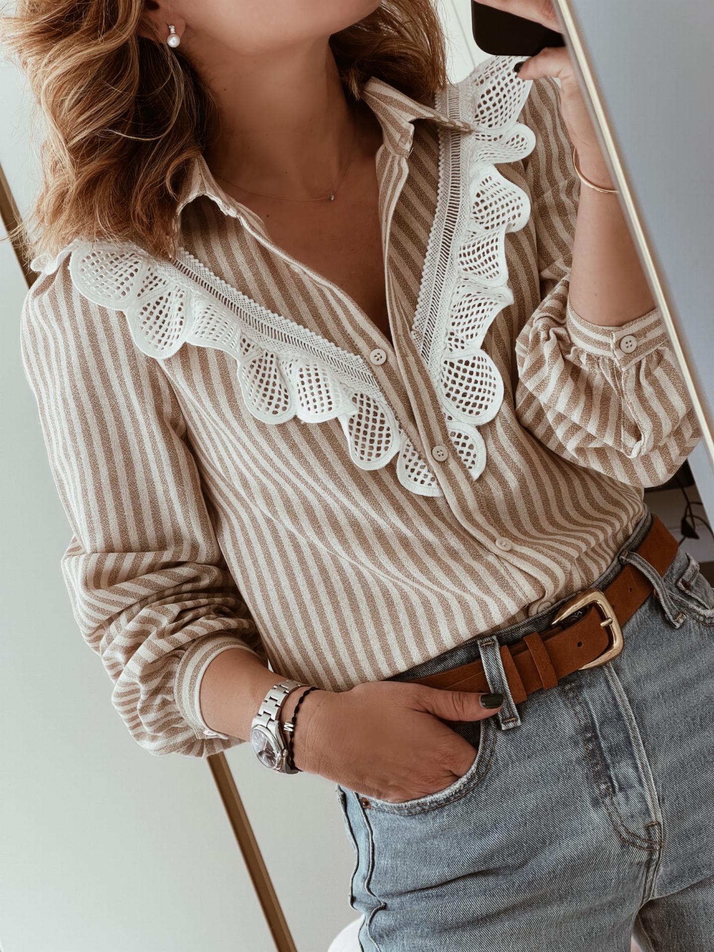Blusa de rayas con cuello camisero con detalle de puntilla en forma de pico en el delantero acando en la espalda.