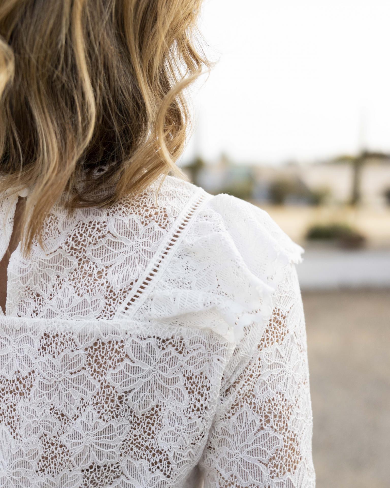 Viene con volante en el delantero en forma de pico. Puños en Guipure con 3 botones.