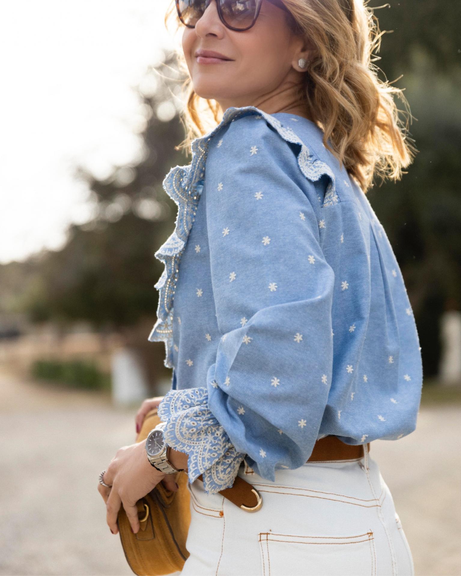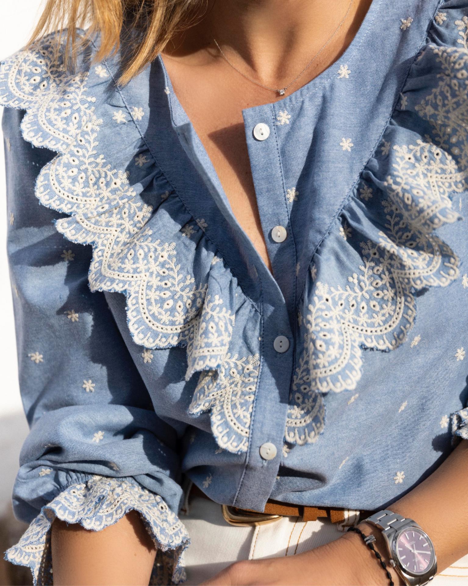 Blusa tejido bordado de manga larga, cuello caja con detalle de volante bordado en forma de pico en delantero y acabado en espalda. Puño con goma y volante bordado.