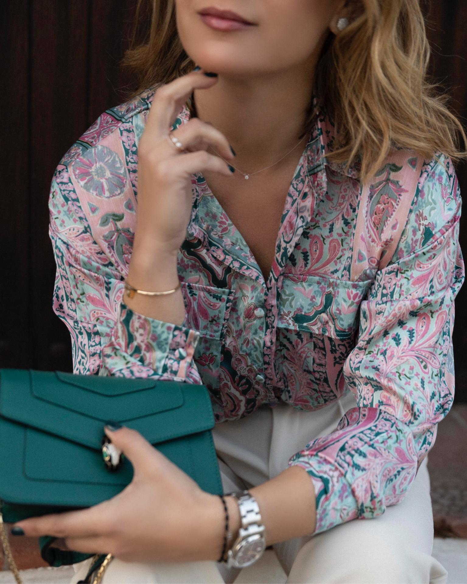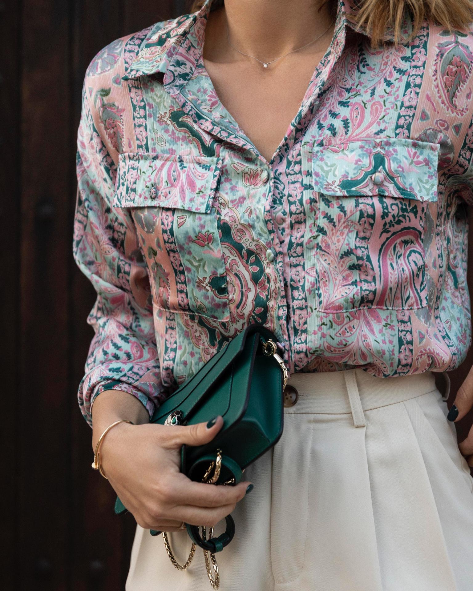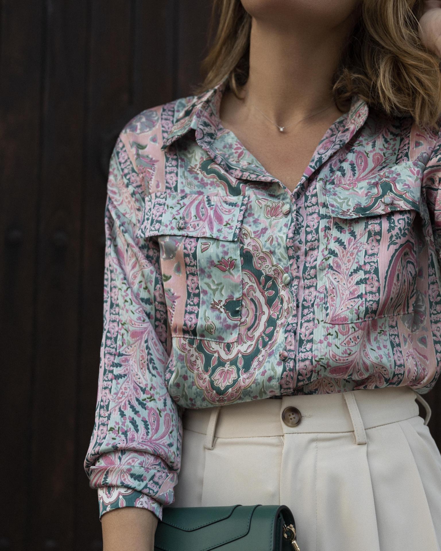 Blusa con cuello camisero con tejido estampado. Viene con 2 bolsillos en el delantero con solapa. Botones forrados del mismo tejido en delantero y puño.