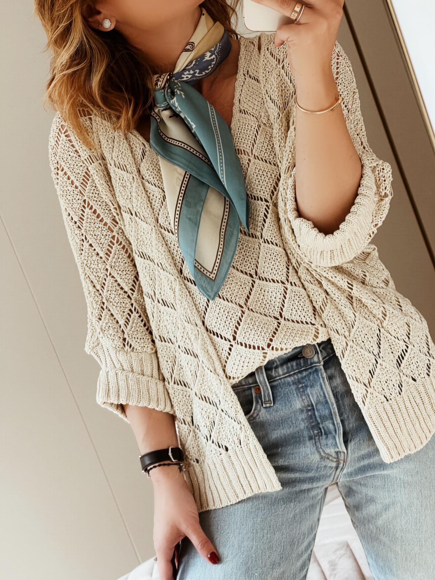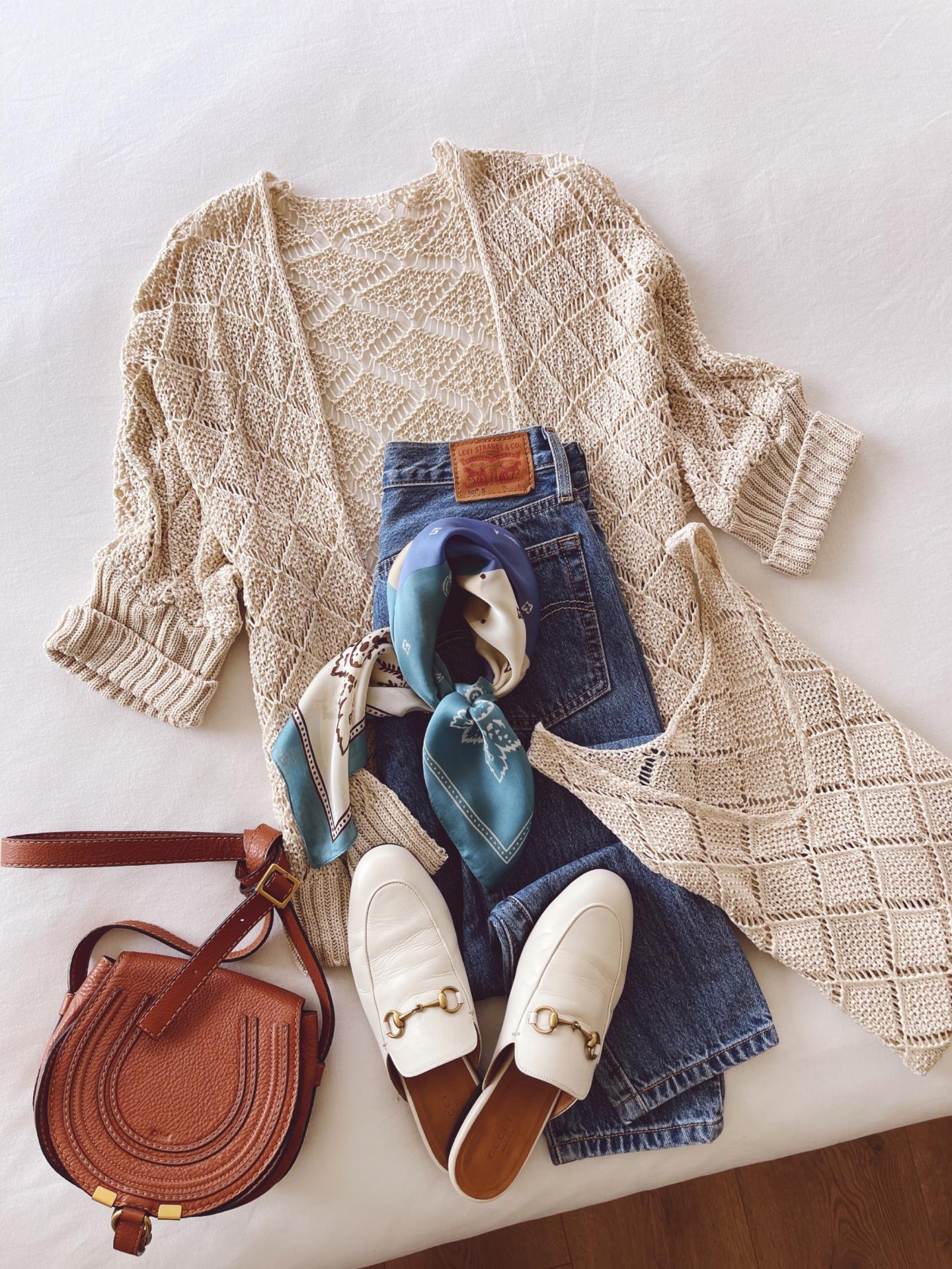 Conjunto de chaqueta manga 3/4 caída y top tirantes en tricot calado.