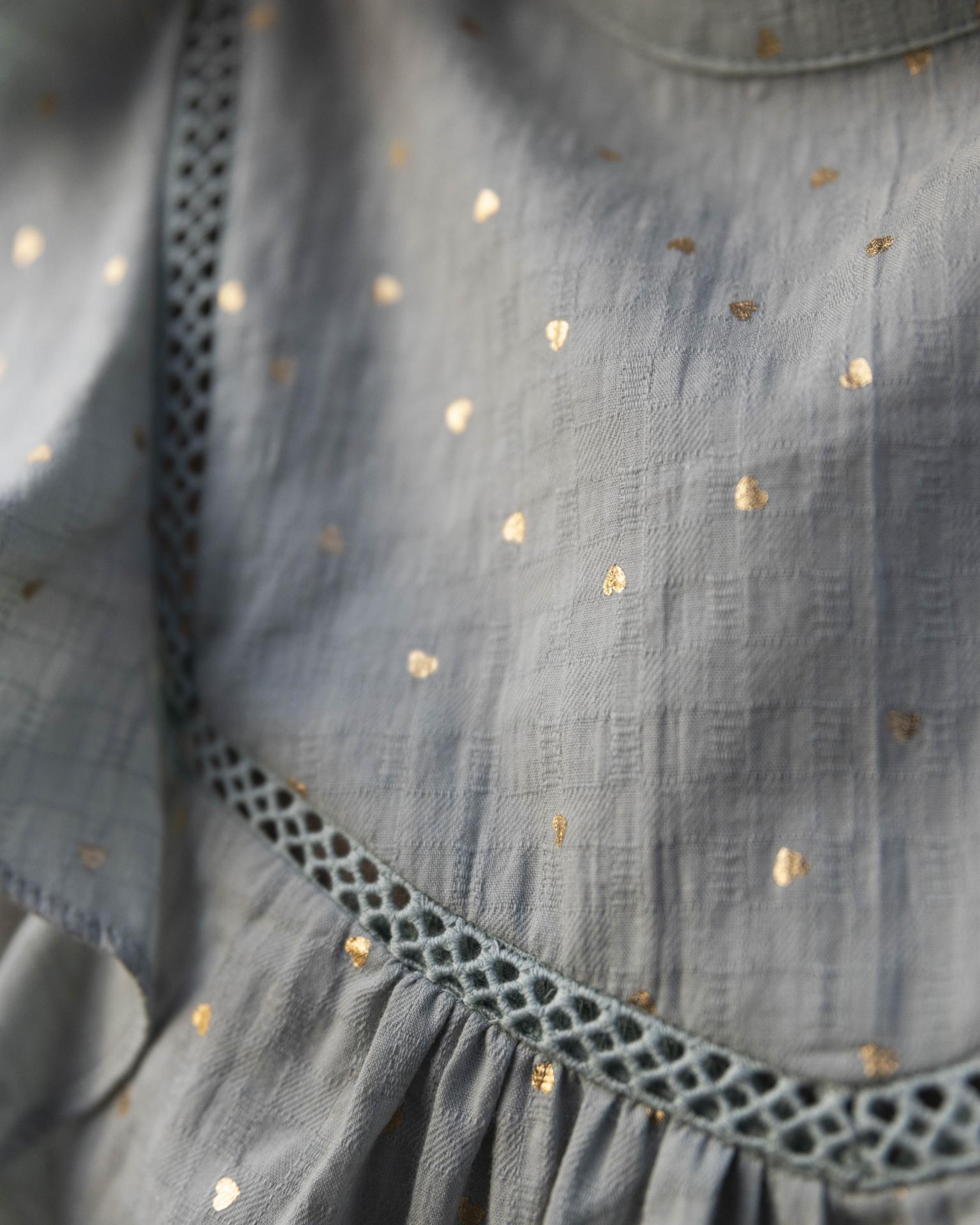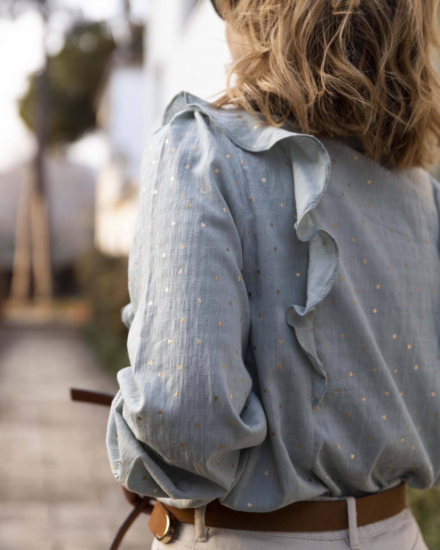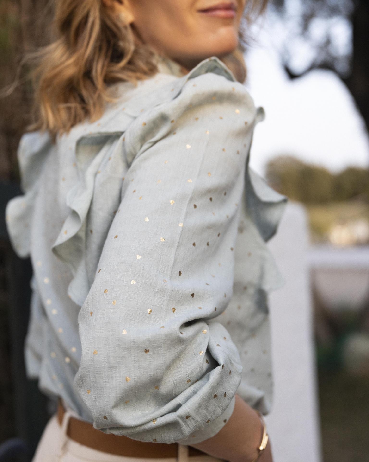 Blusa cuello caja con volante y detalle de volante en el delantero y hombros. Se abrocha por la espalda con un botón. Disponible en color verde vintage con corazones estampados en color oro.