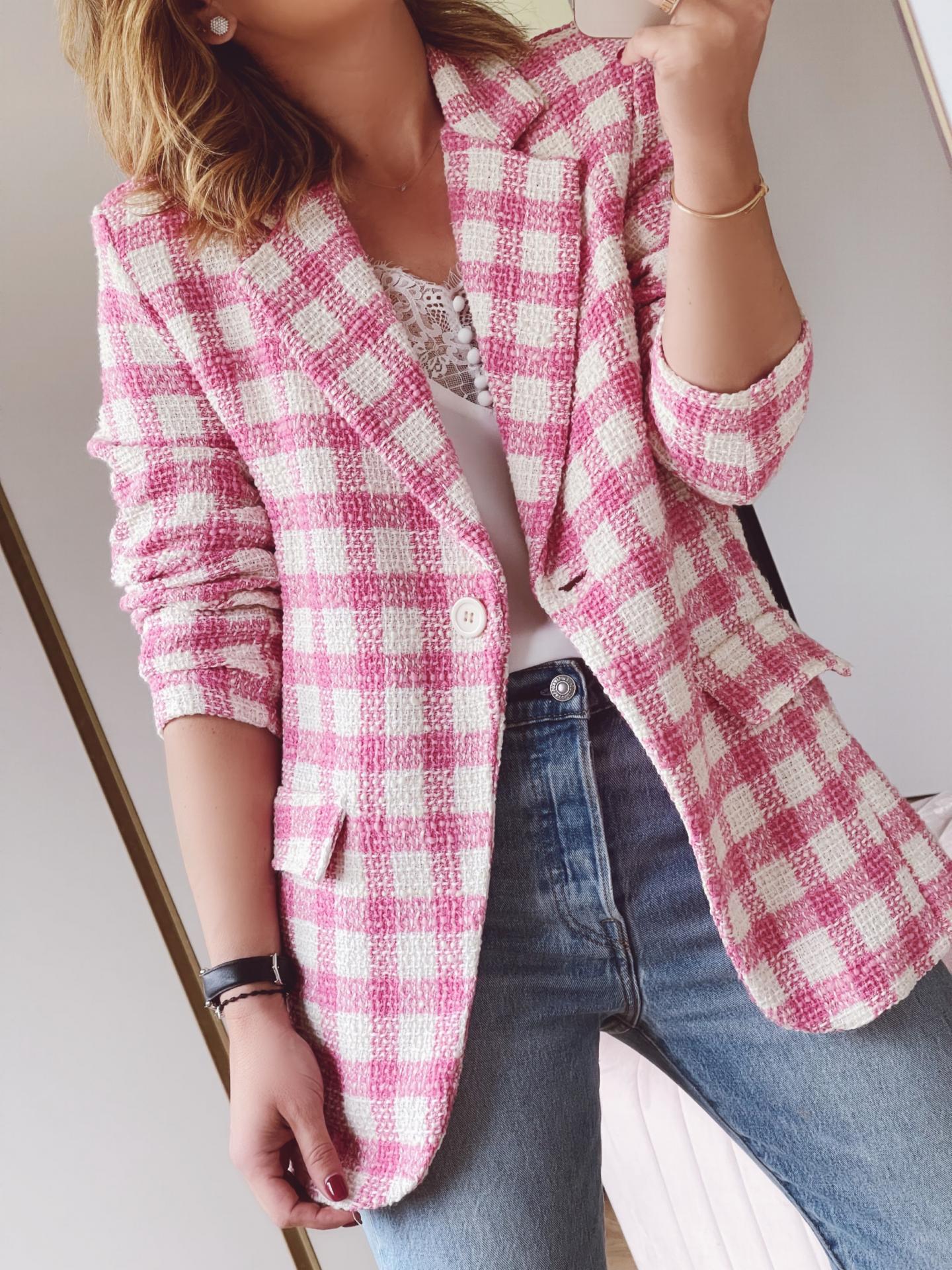 Blazer de cuadros de corte recto , con tapeta de falsos bolsillos en el delantero. Viene forrado