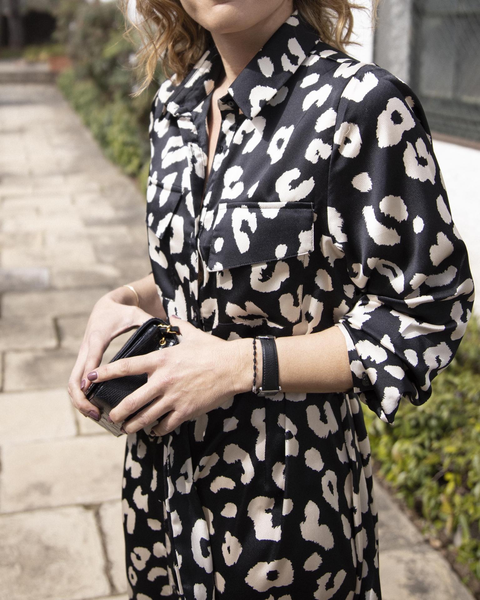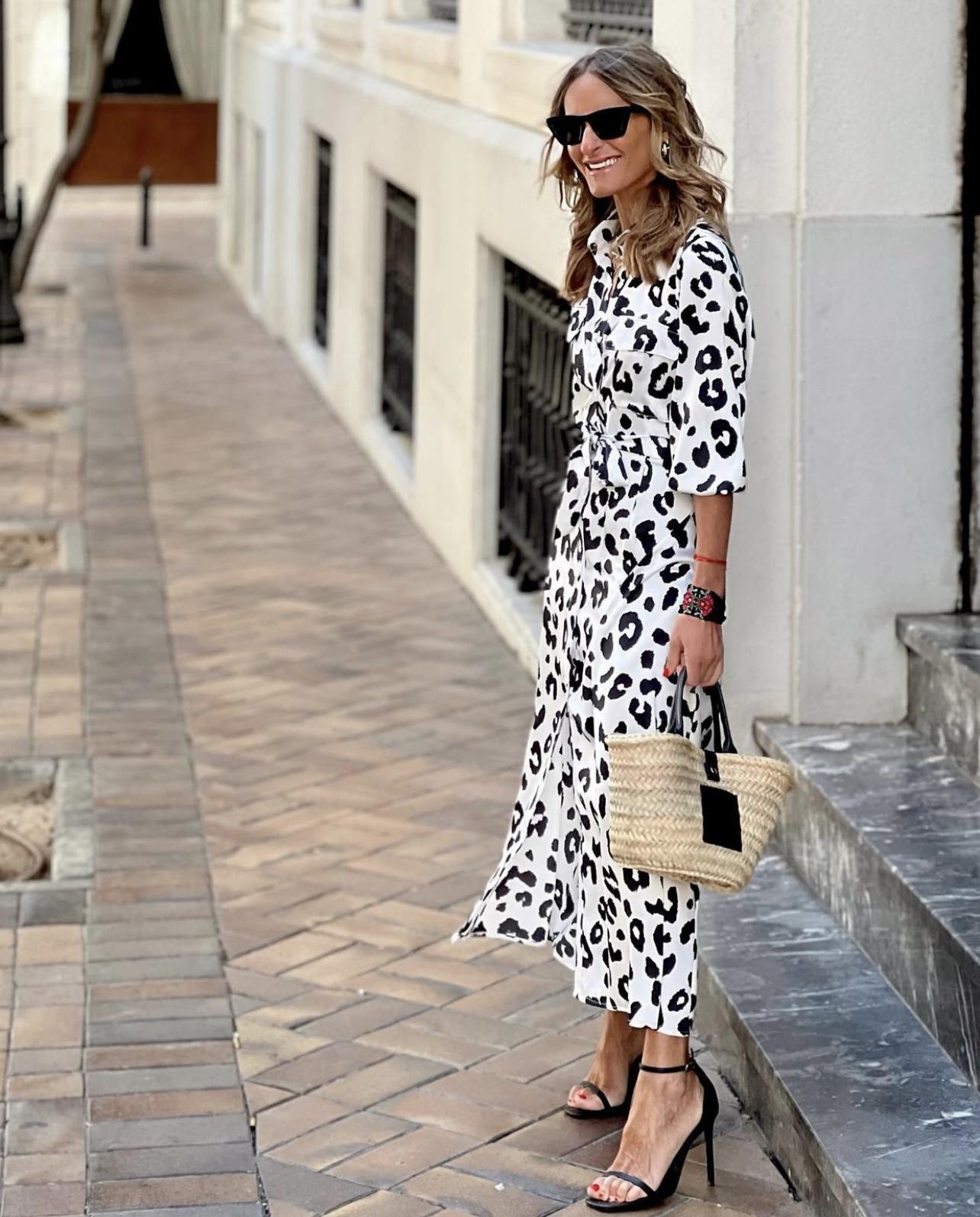 Vestido camisero estampado largo , cortado por la cintura con cinturon del mismo tejido y falda corte evasé.