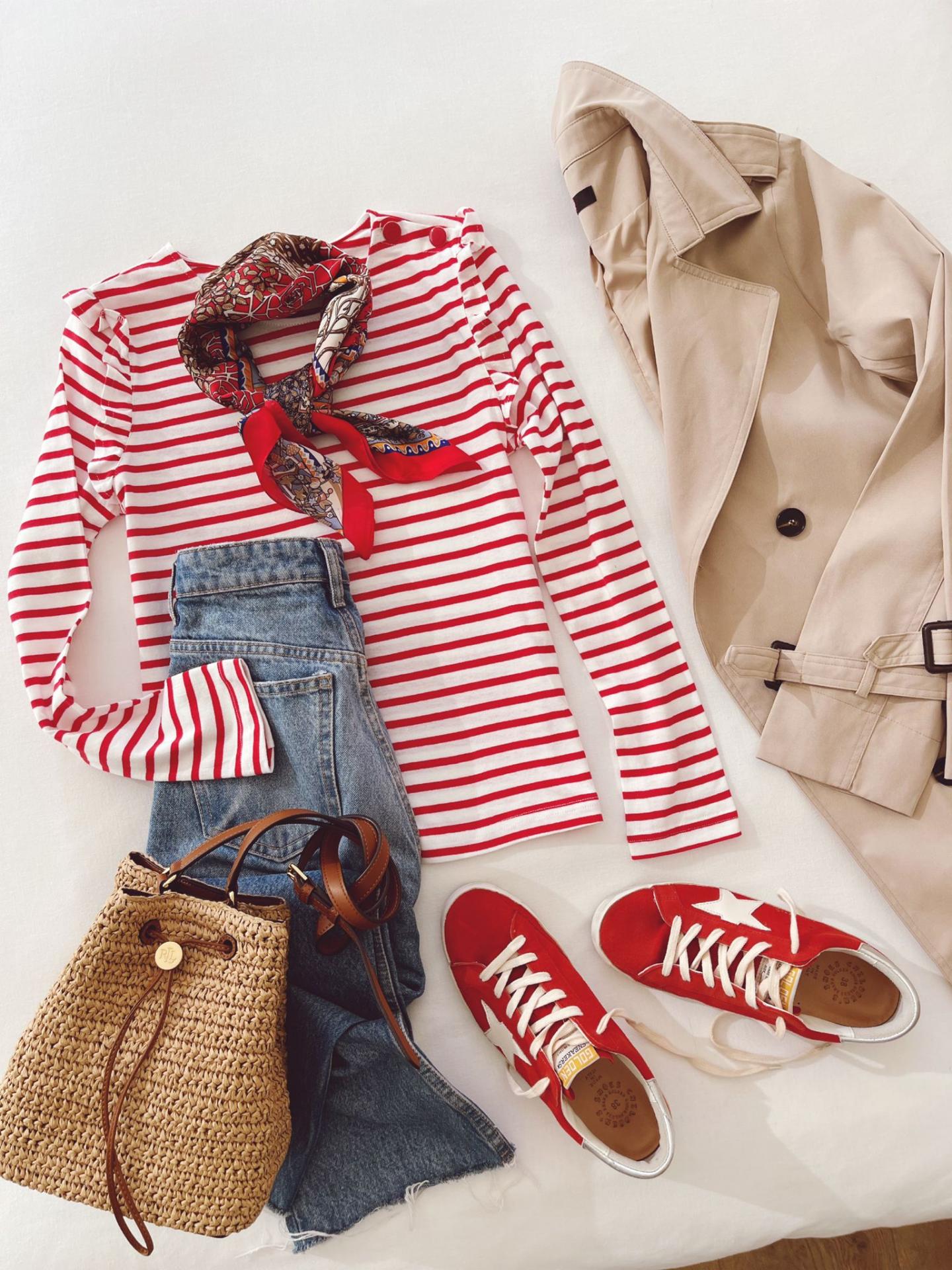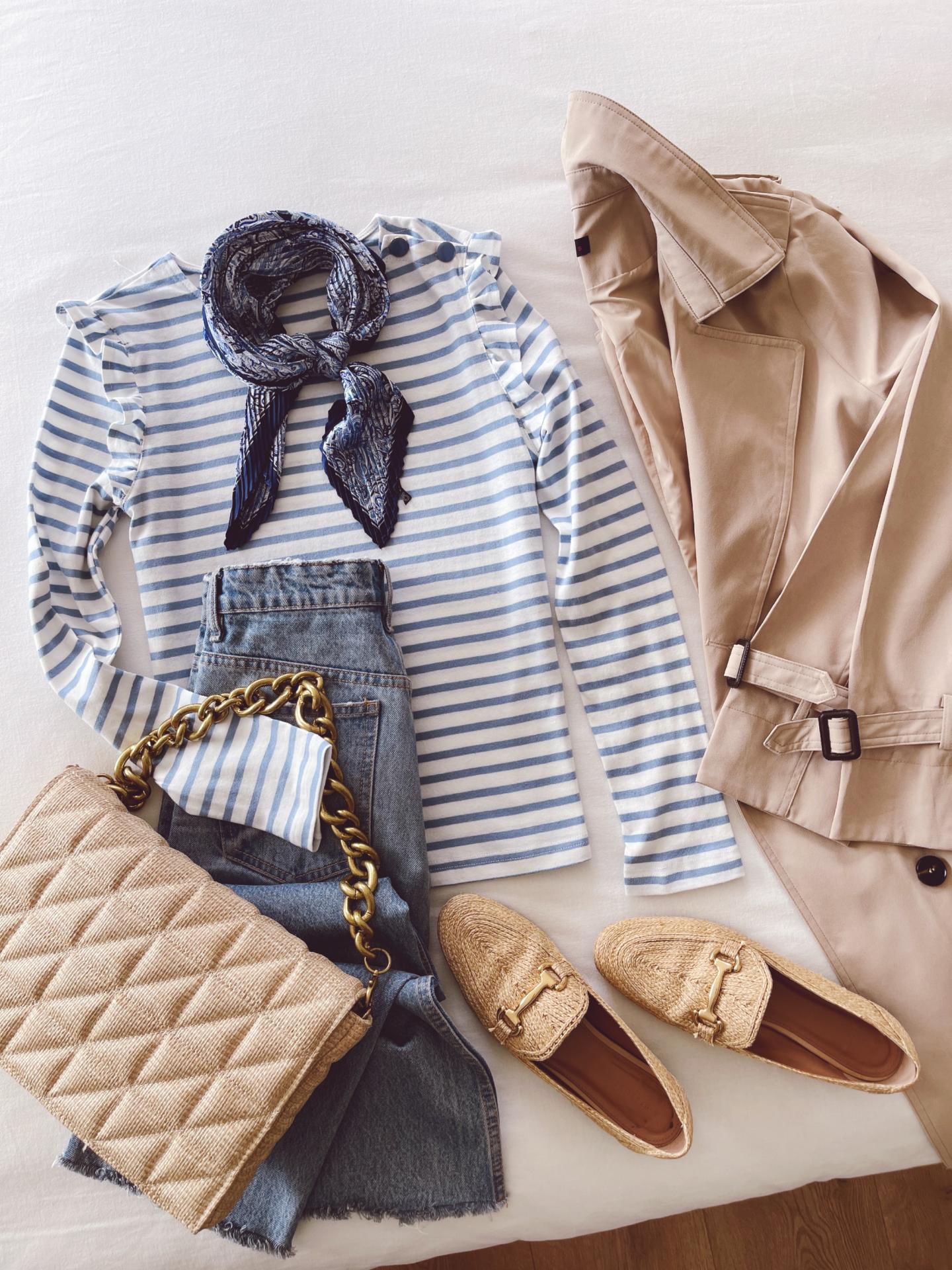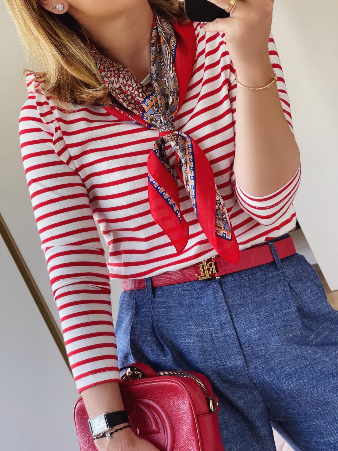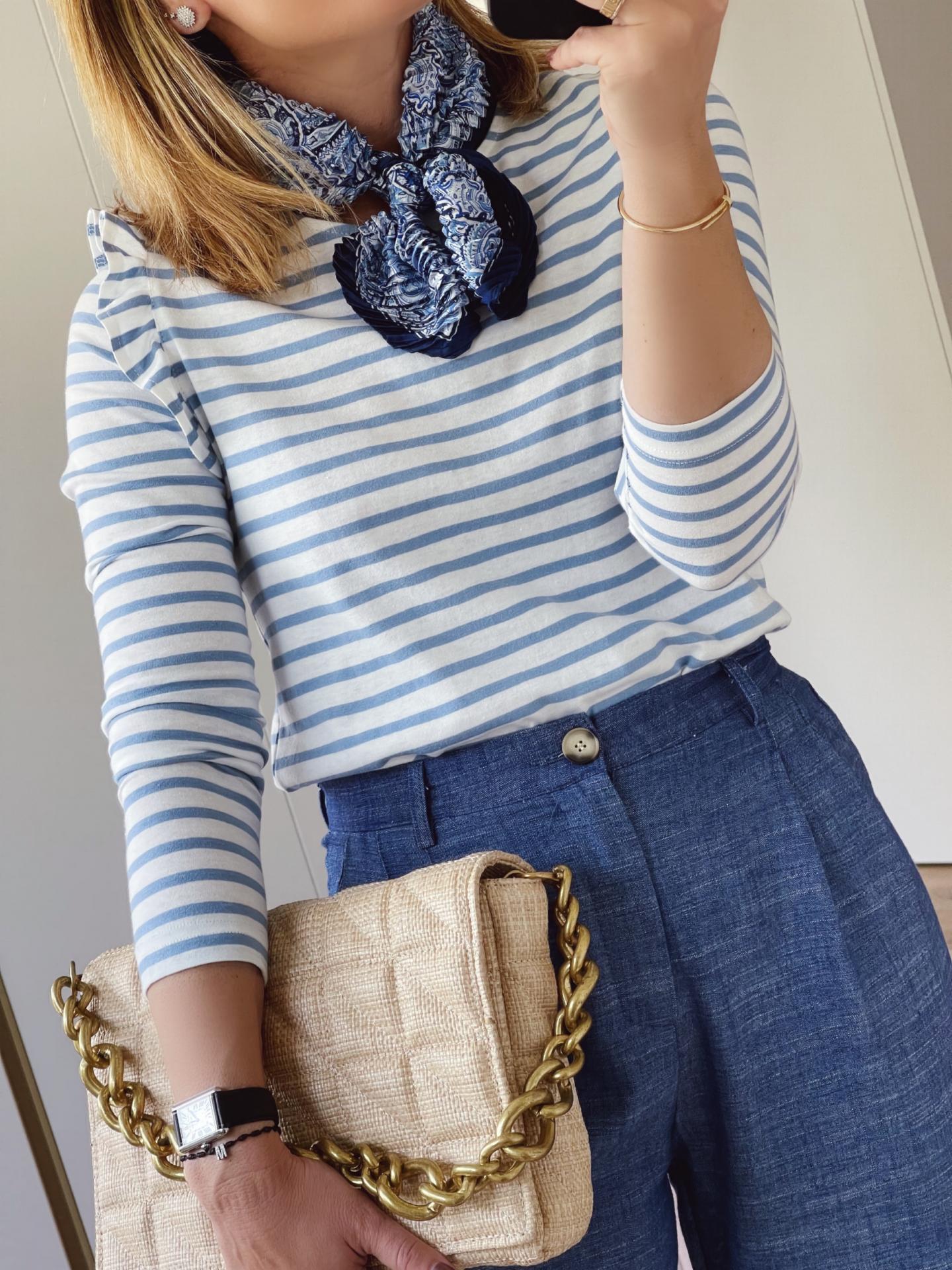 Camiseta de rayas, cuello redondo y abotonada en el hombro. Viene con un pequeño volante alrededor de la sisa. Corte recto.