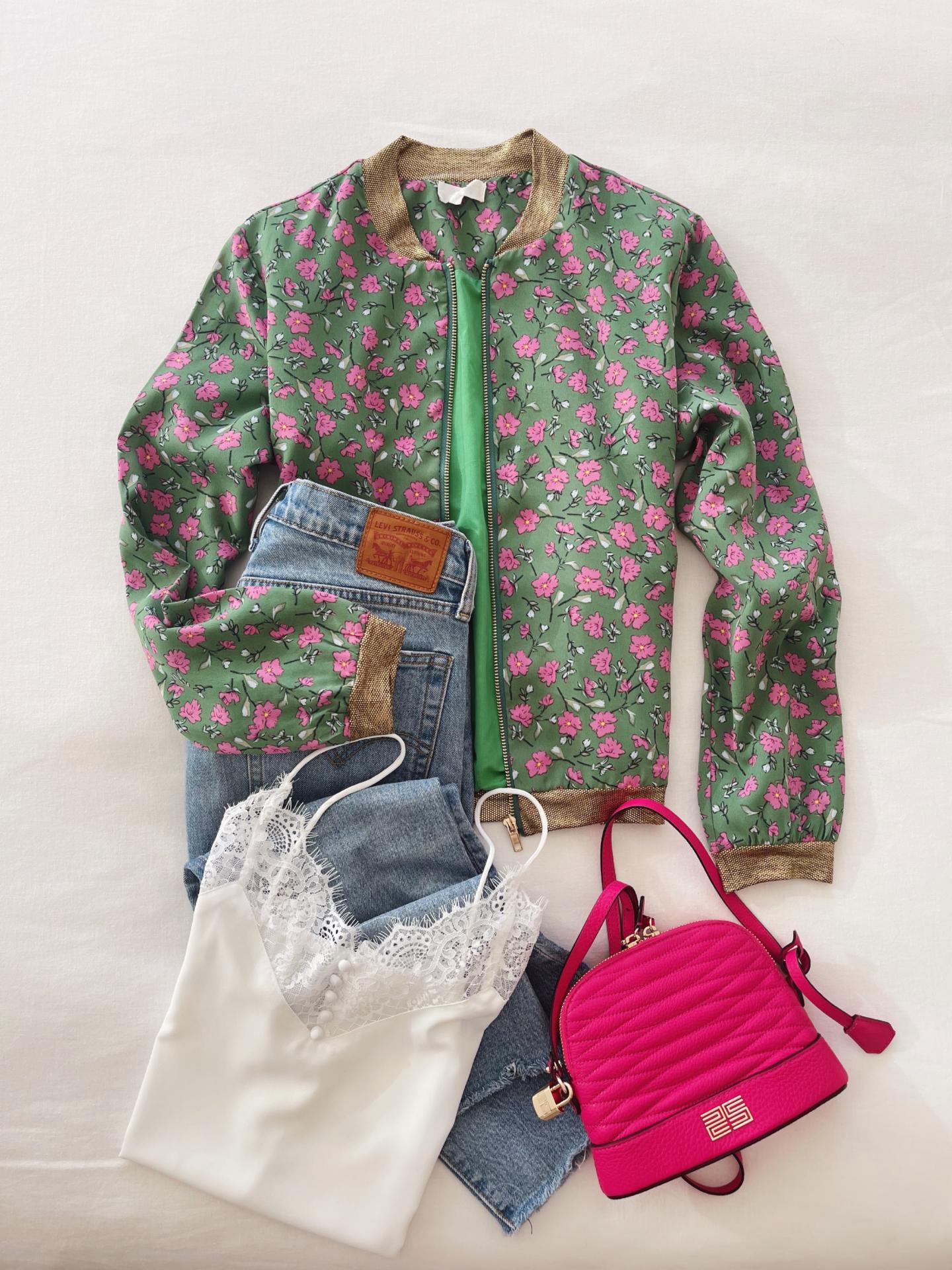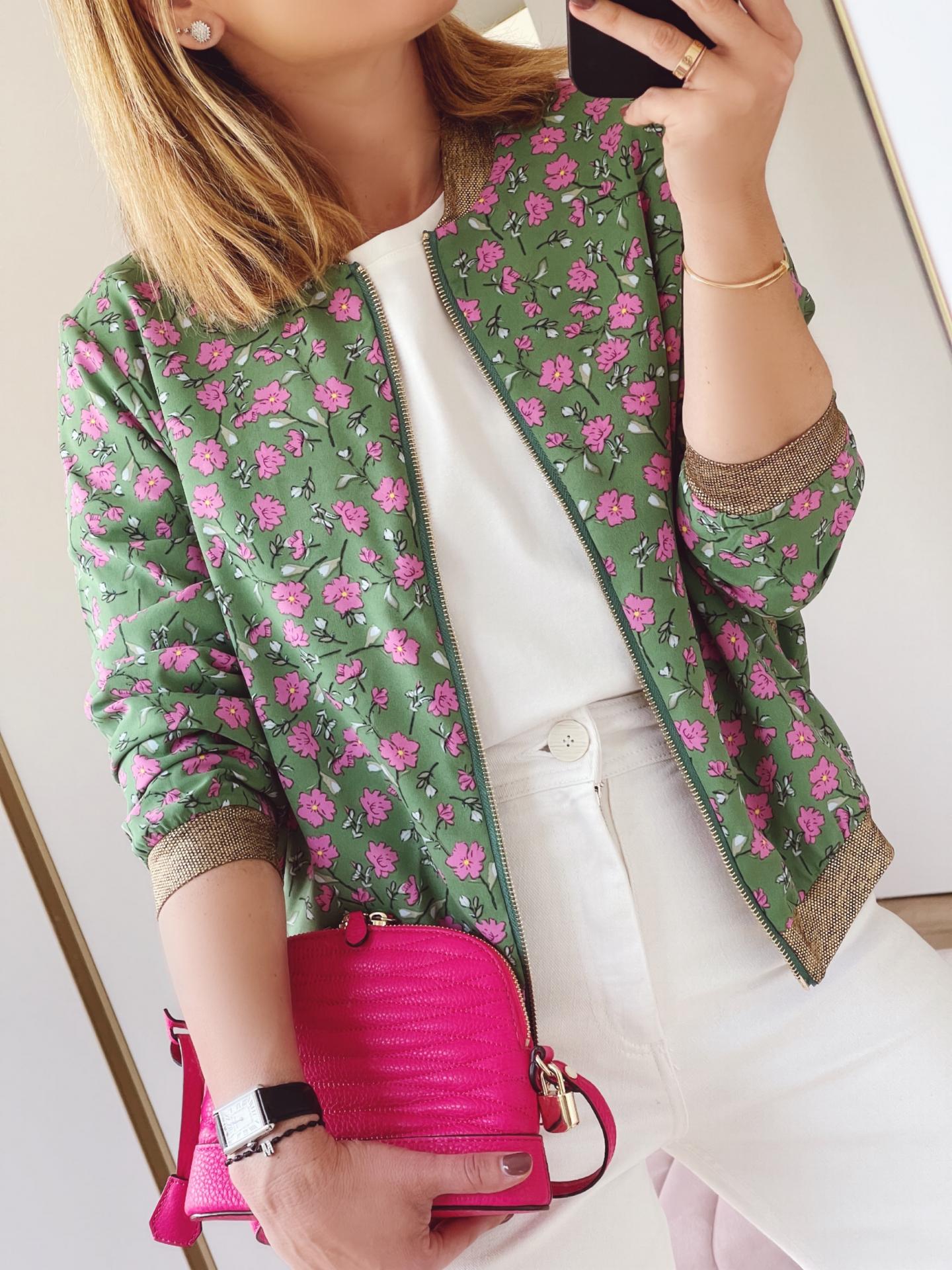 Nueva Bomber de miniflores con detalles dorados en puño, cuello y mangas.