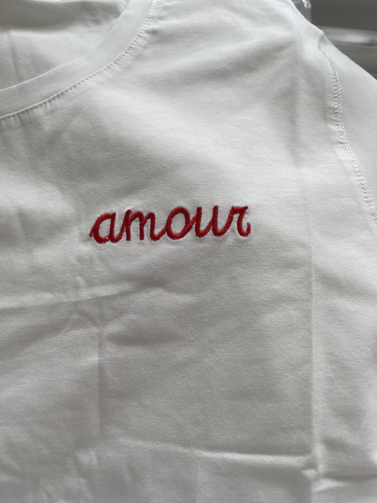 Camiseta de manga borta con mensaje Amour bordado rojo.