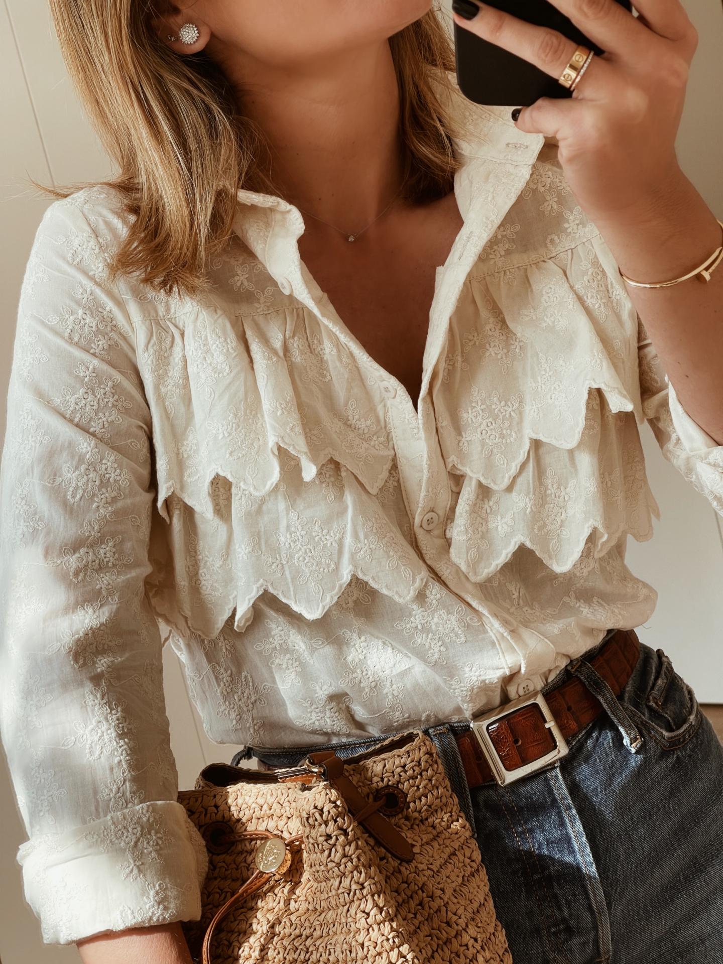 Blusa tejido bordado con cuello camisero y doble volante en el delantero. Bajo ligeramente redondeado.