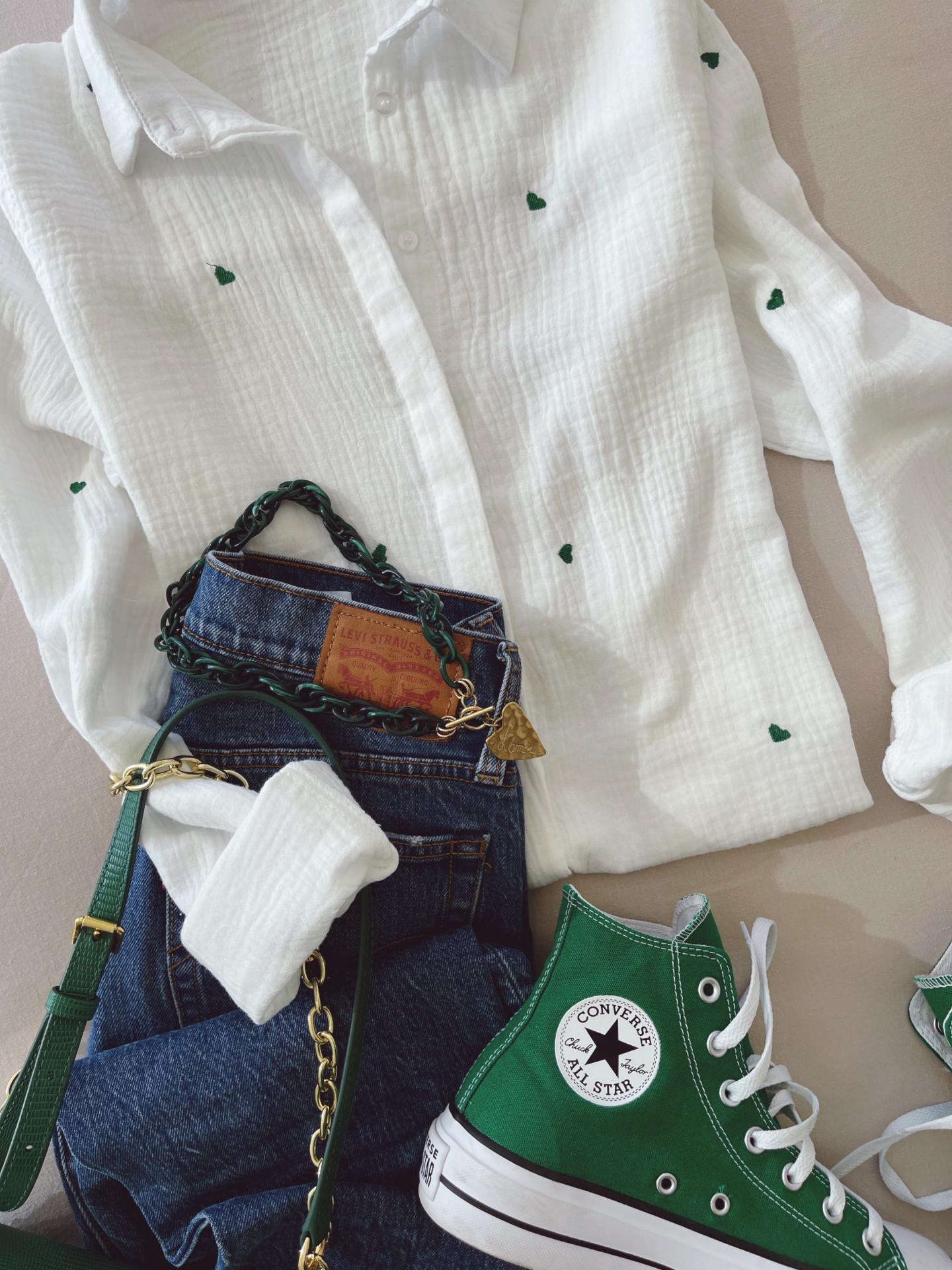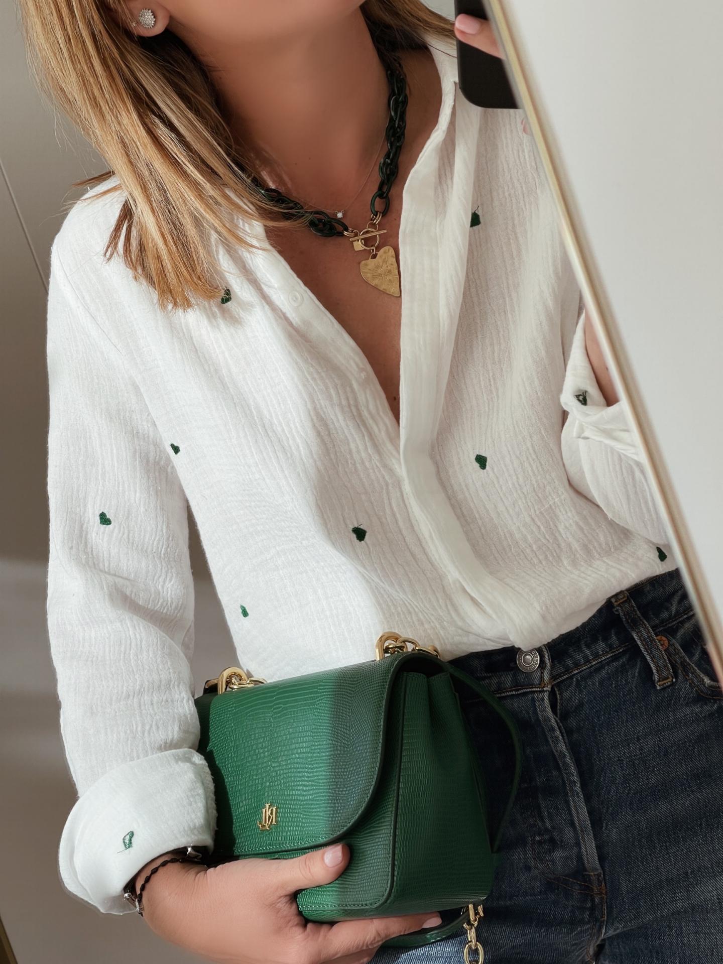 Camisa de manga larga y cuello camisero con tejido de bambula y detalle de corazones bordados.