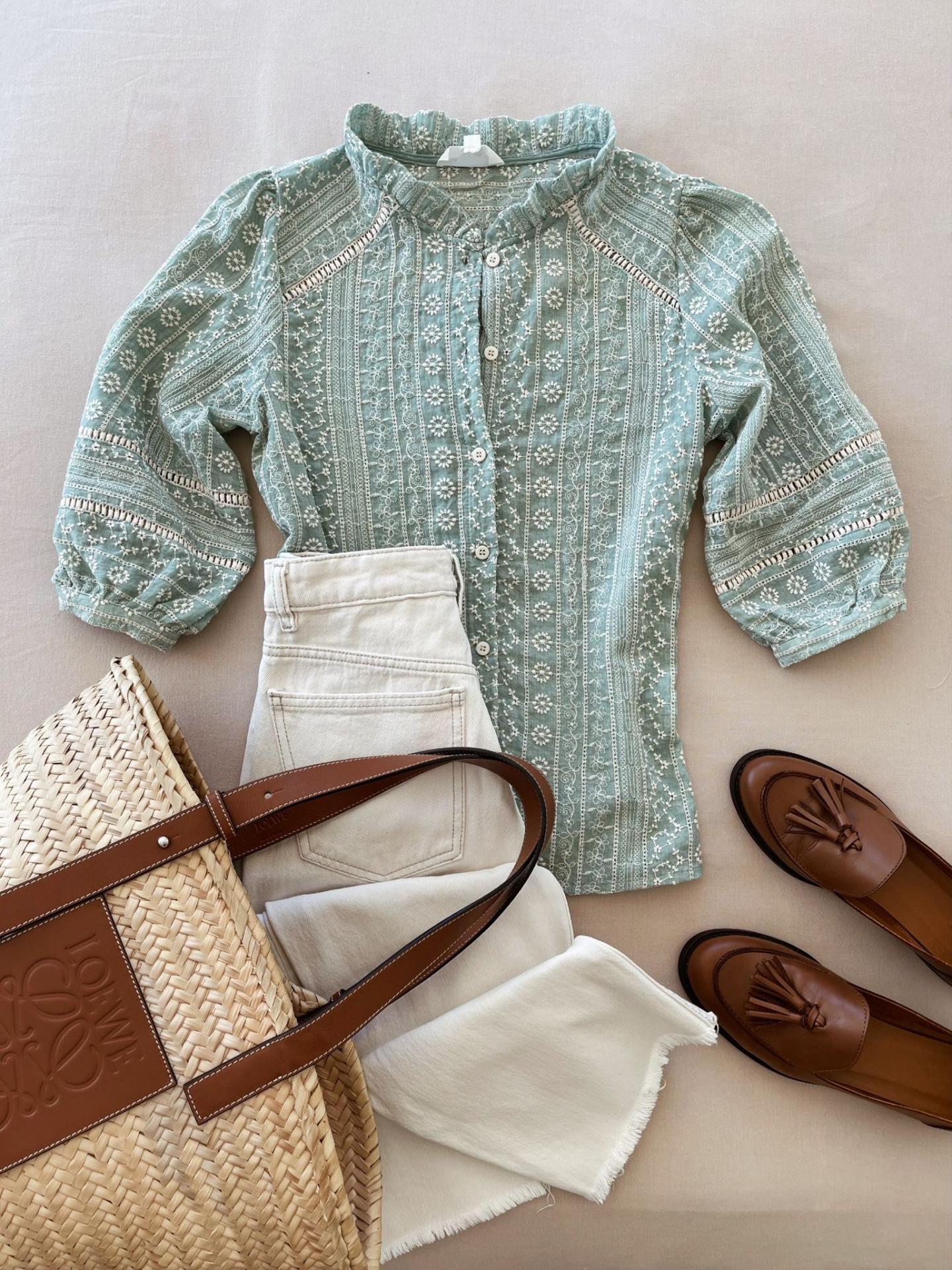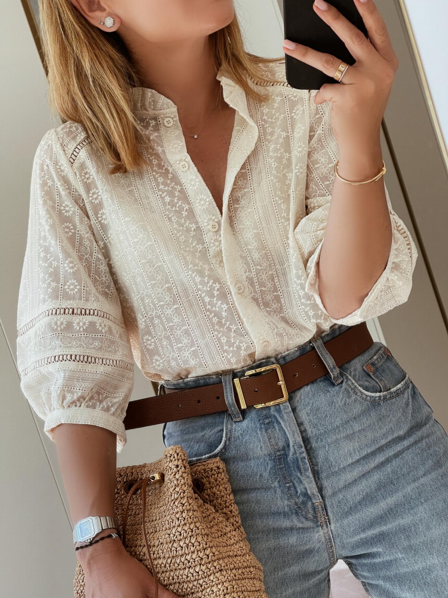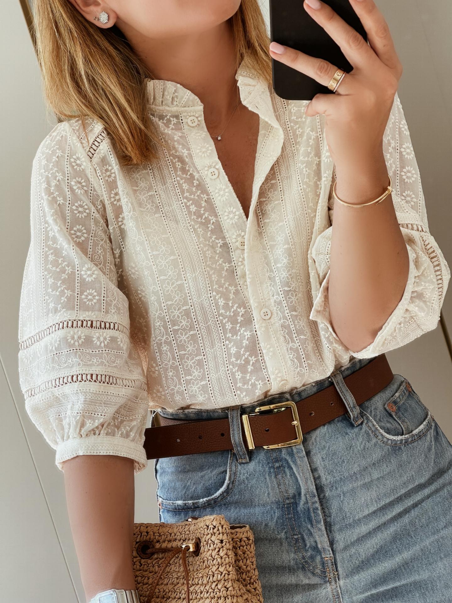 Blusa tejido bordado , cuello caja con volante alrededor y manga francesa con botón. Viene con detalles de entredós en delantero , mangas y espalda. Corte recto.