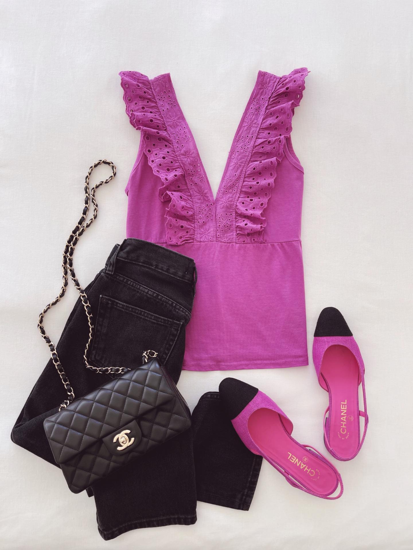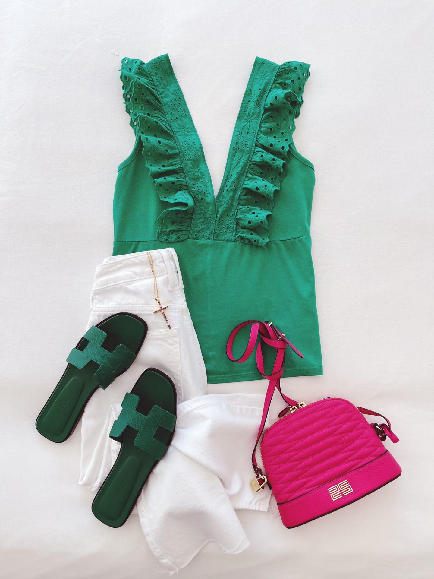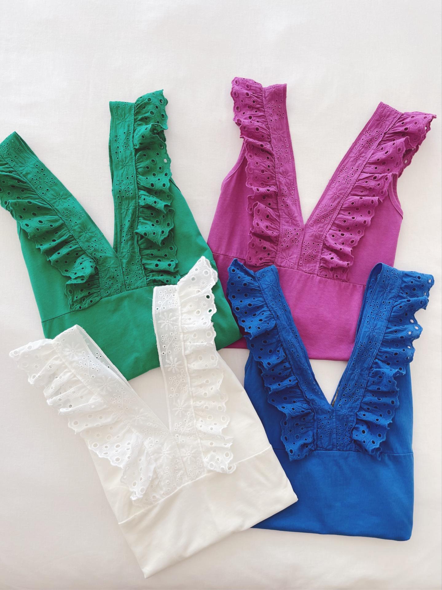 Camiseta con escote en pico en el delantero y la espalda , lleva volante bordado en el delantero y hombro. Camiseta de corte ligeramente entallado