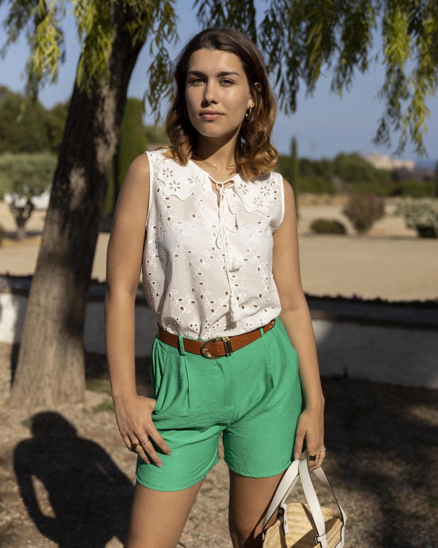 Short con pinzas y bolsillos laterales en el delantero. Viene con goma por la parte trasera de la cintura.