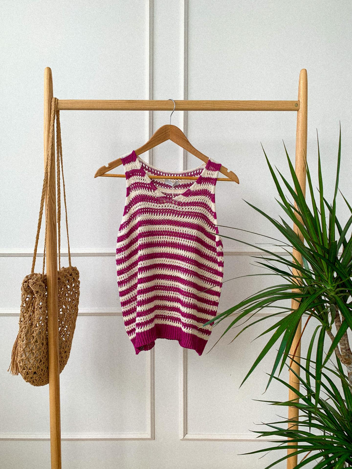 Top crochet de rayas sin mangas y cuello en forma de pico.