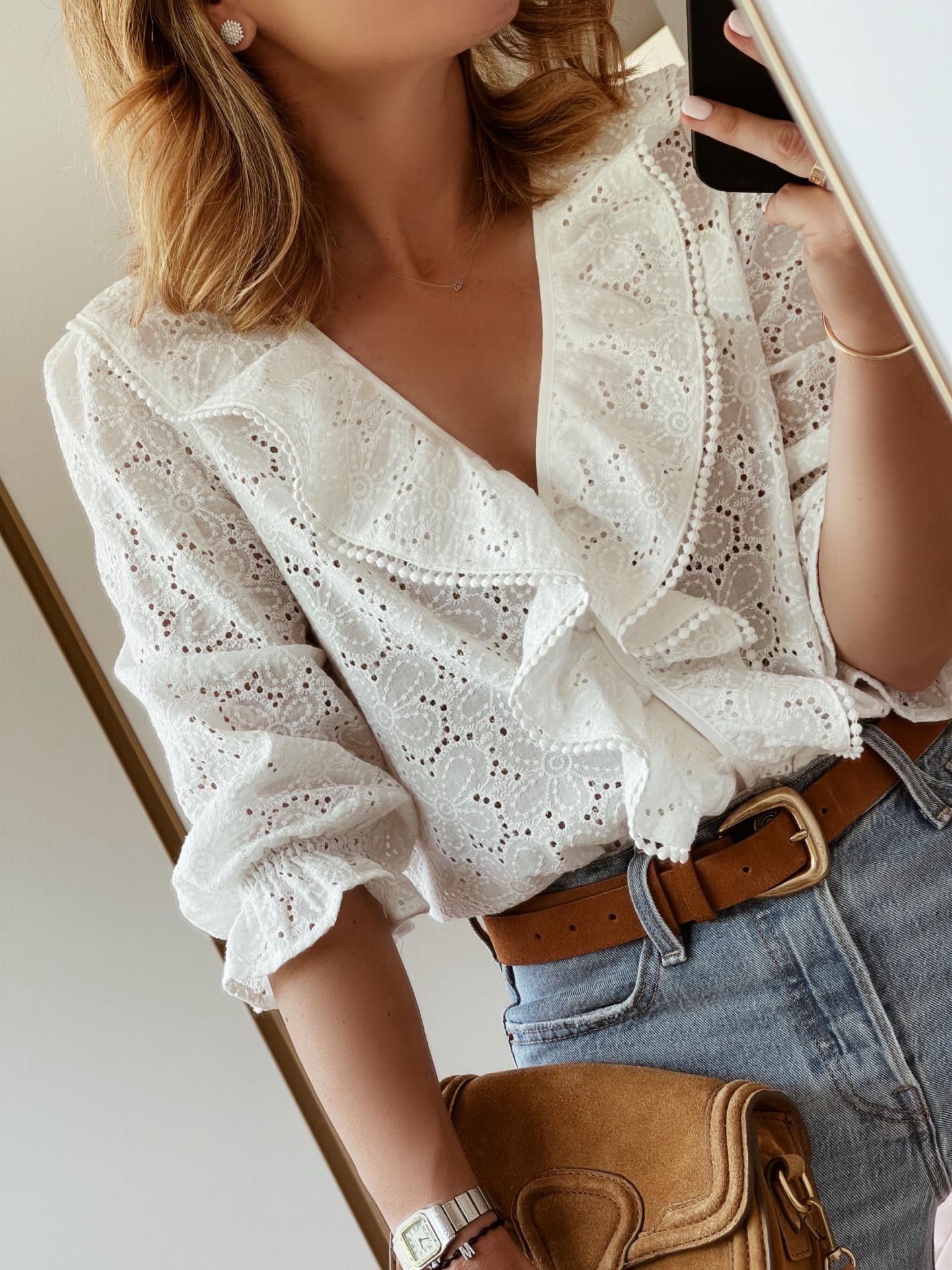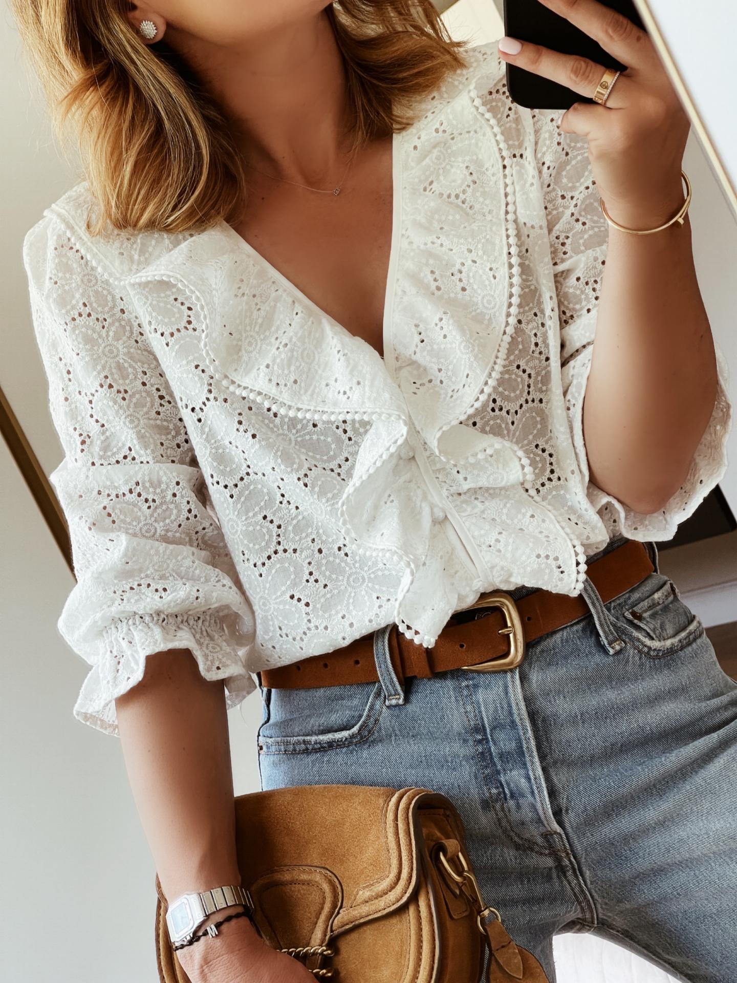 Blusa Adela de tejido bordado, manga francesa con goma creando volante