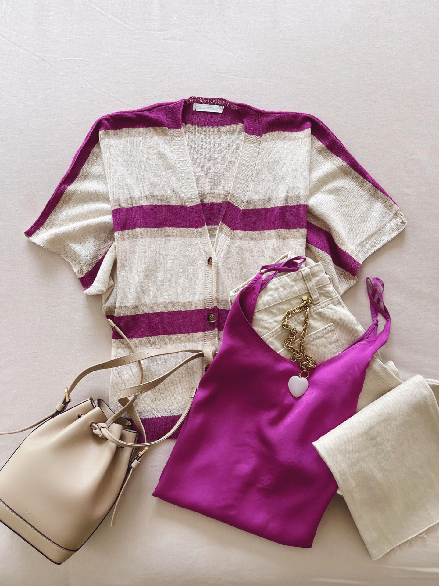 Chaqueta de punto con manga corta caída estilo japonesa , abotonada y escote en pico .